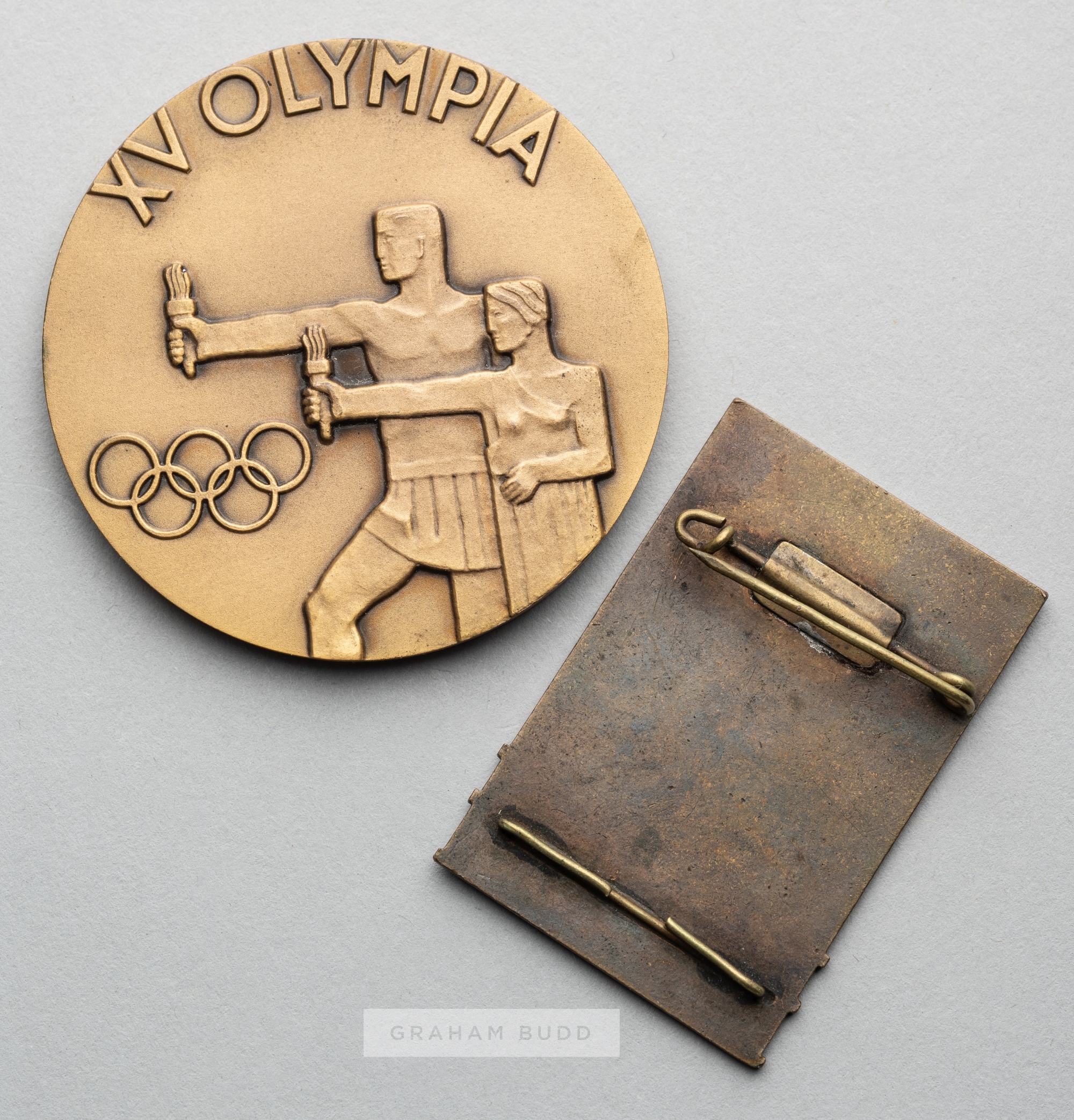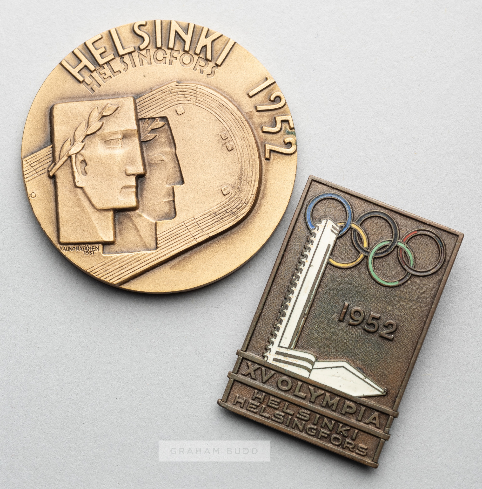 Helsinki 1952 Olympic Games participant's medal, designed by K Rasanen, bronze, obverse with stylised heads over the Olympic Stadium, inscribed HELSINKI 1952 HELSINGFORS, stamped KAUKORASANEN 1951, reverse with male and female athletes holding torches over Olympic Rings, inscribed XV OLYMPIA, diameter 54mm., weight 78gms., in original paper box with Olympic Rings in gilt tooling; sold together with a participants bronze and coloured enamel 1952 Helsinki lapel badge, depicting the Olympic Stadium tower and Olympics Rings, inscribed 1952 XV OLYMPIA HELSINKI HELSINGFORS, with badge pins to reverse, 48 by 33mm., some enamel losses, (2)