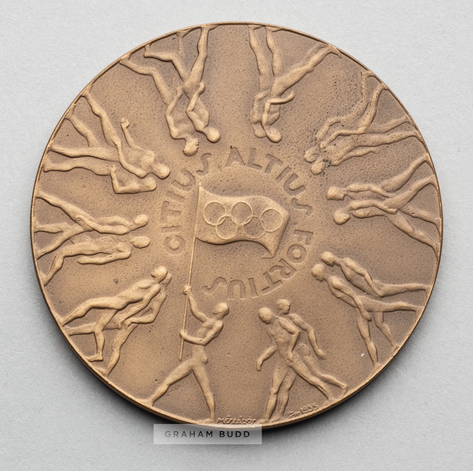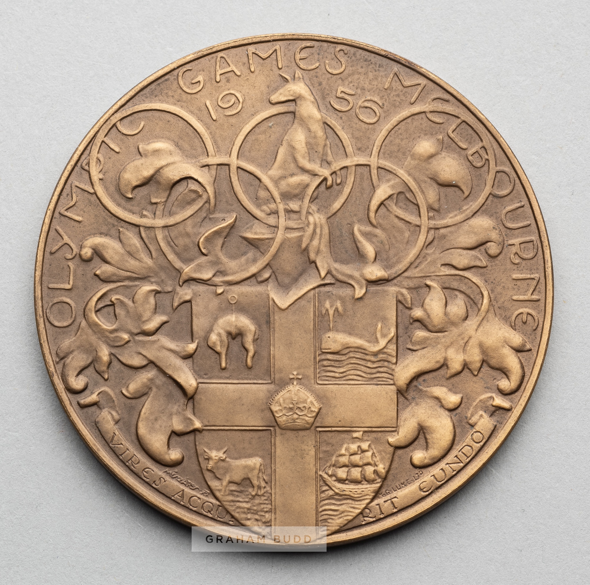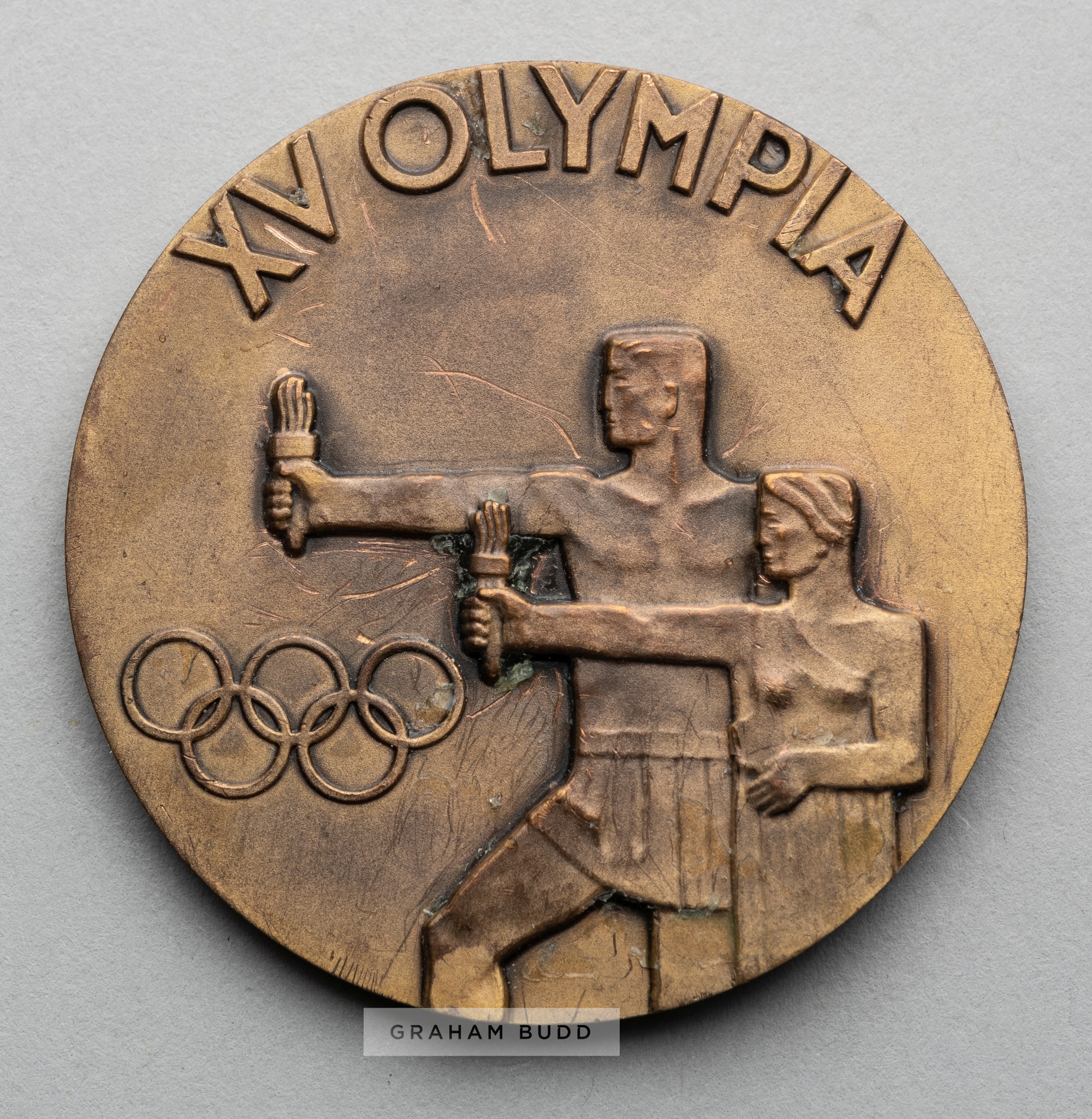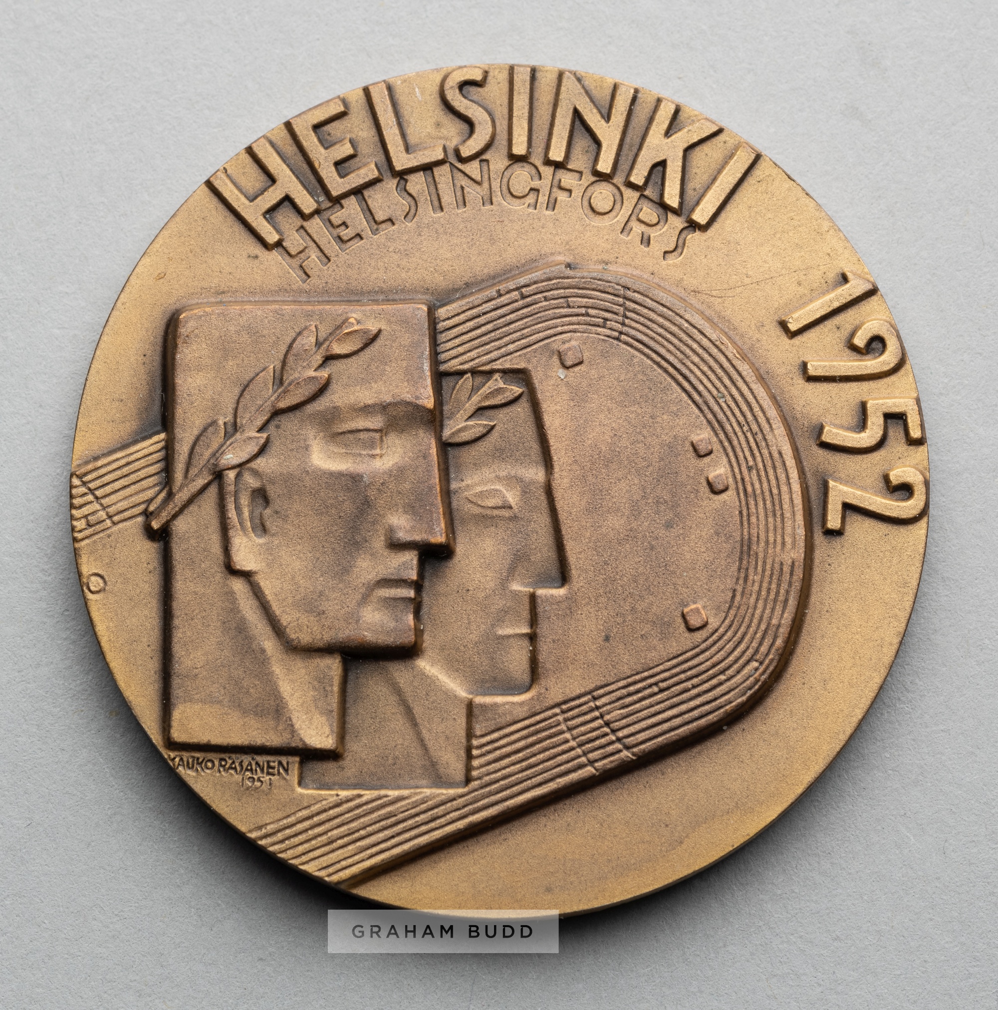 Two Olympic Games participant's medals for Helsinki 1952 and Melbourne 1956, comprising Helsinki 1952 Olympic Games participant's medal, designed by K Rasanen, bronze, obverse with stylised heads over the Olympic Stadium, inscribed HELSINKI 1952 HELSINGFORS, stamped KAUKORASANEN 1951, reverse with male and female athletes holding torches over Olympic Rings, inscribed XV OLYMPIA, diameter 54mm., weight 77gms., bears some surface wear and Melbourne 1956 Olympic Games participant's medal, designed by A. Meszaros, bronze, obverse with the Olympic Motto within a circle of athletes marching in pairs, inscribed CITIUS ALTIUS FORTIUS, reverse with Olympic Rings over the City Arms of Melbourne, inscribed OLYMPIC GAMES MELBOURNE 1956, diameter 63mm., weight 103gms, in one half of original circular clear plastic case, (2)
