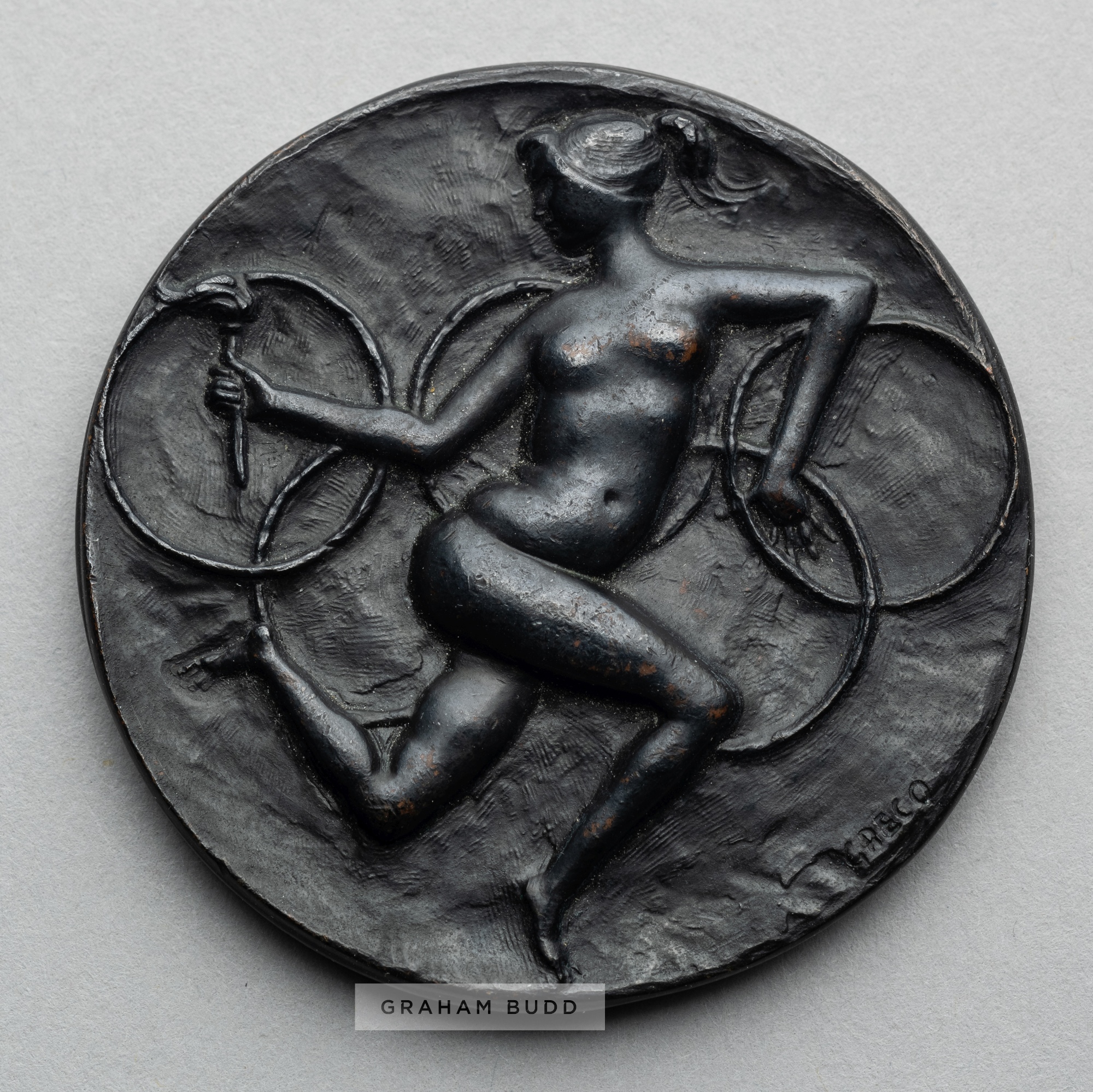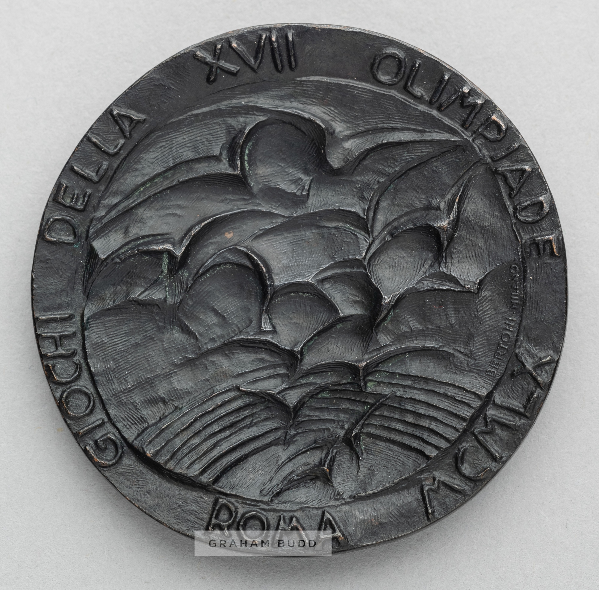 Rome 1960 Olympic Games participant's medal, designed by Prof. E. Greco, bronze, obverse depicting a nude female torchbearer superimposed over the Olympic Rings, stamped GRECO, reverse with a flight of eagles soaring over the Rome Olympic Stadium, inscribed GIOCHI DELLA XVII OLIMPIADE ROMA MCMLX, diameter 54mm., weight 77gms.