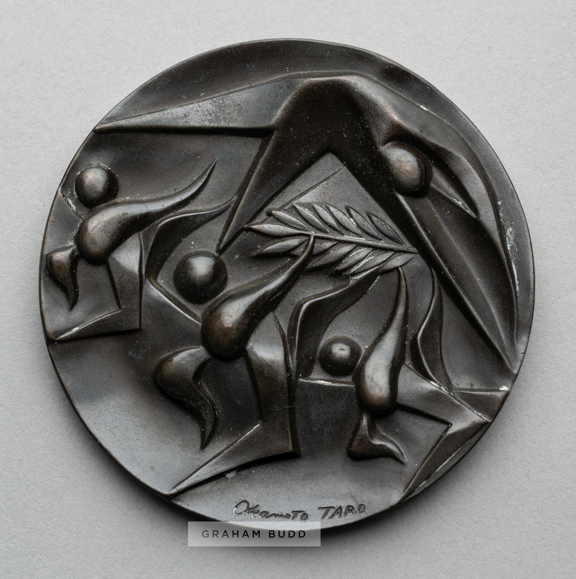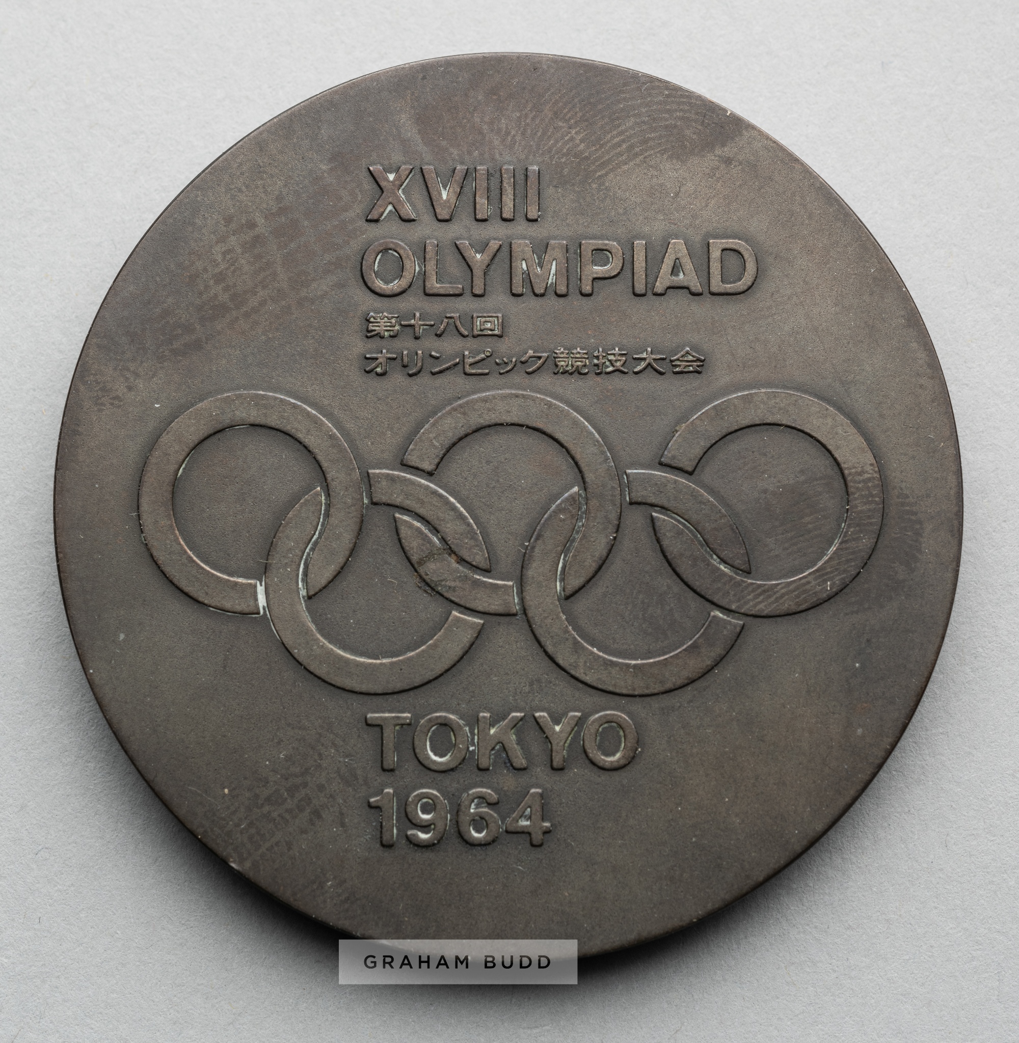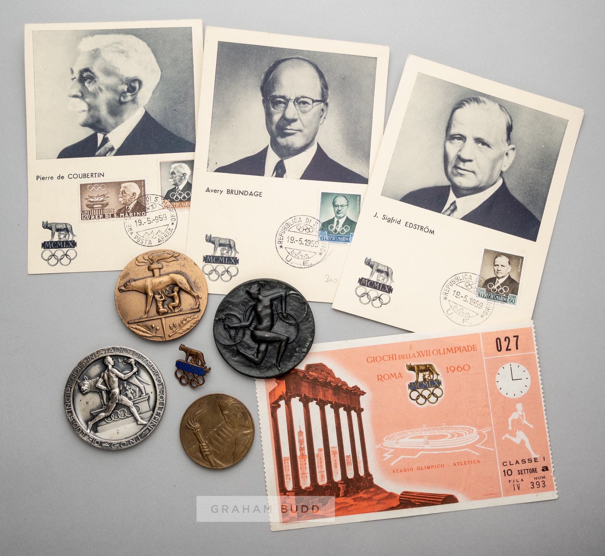 Two Olympic Games participant's medals for Rome 1960 and Tokyo 1964 with memorabilia, comprising Rome 1960 Olympic Games participant's bronze medal designed by Prof. E. Greco, obverse depicting a nude female torchbearer superimposed over the Olympic Rings, reverse depicting flight of eagles soaring over the Rome stadium, diameter 55mm., weight 79gms.; two bronze commemorative medals and another in silver; a pin; a ticket for athletics of 10th September; and three postcards, featuring Pierre de Coubertin, Sigfrid Edstrom & Avery Brundage, all with San Marino postage stamps and postmarks and Tokyo 1964 Olympic Games participant's medal, designed by T. Okamoto and K. Tanaka, copper, obverse with stylised figures of three runners and a swimmer, inscribed OKAMOTO TANAKA, reverse with Olympic Rings and legend in Japanese and English, inscribed XVIII OLYMPIAD TOKYO 1964, rim bearing mint stamp, diameter 61mm., weight 119gms., (10)