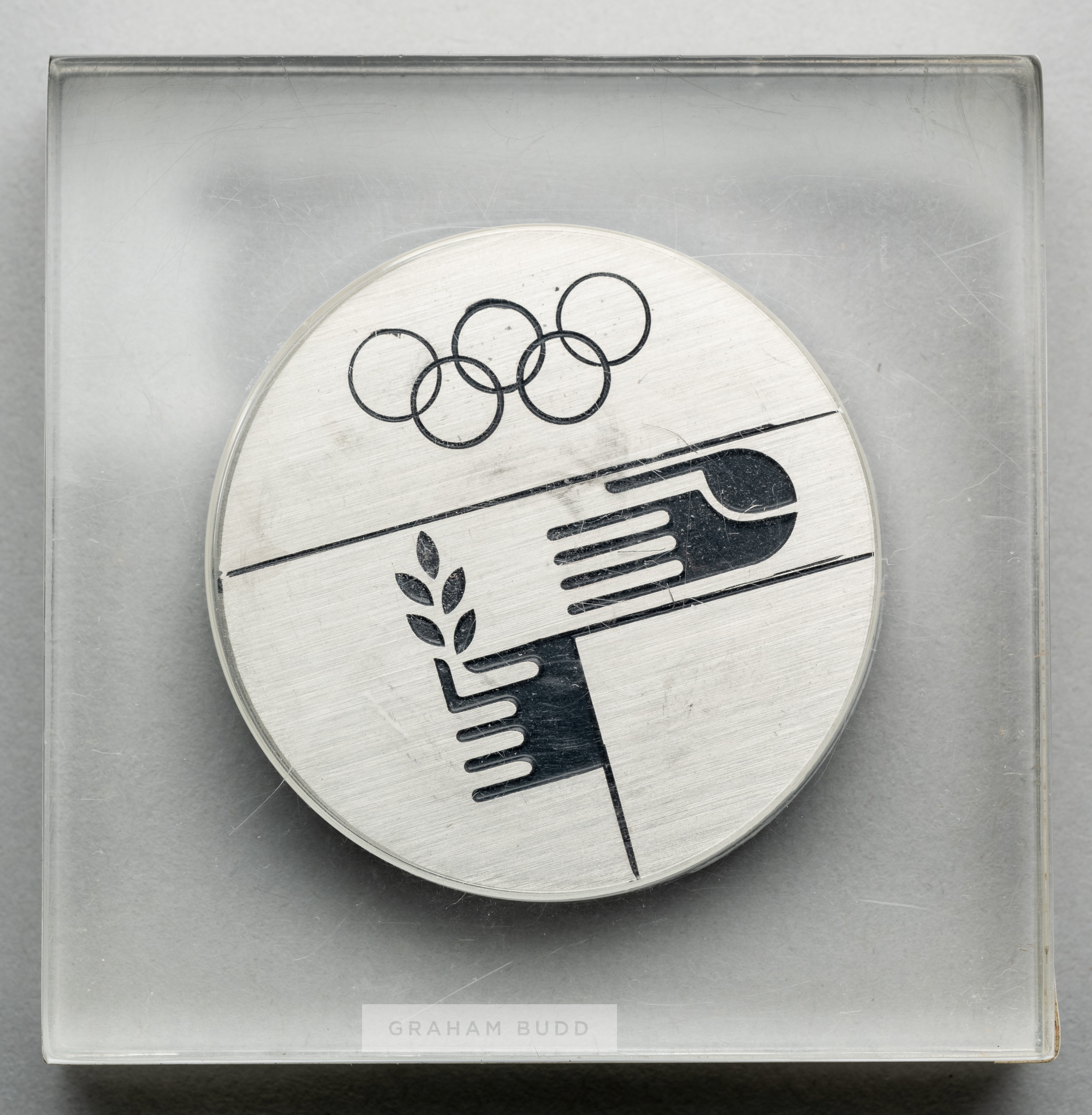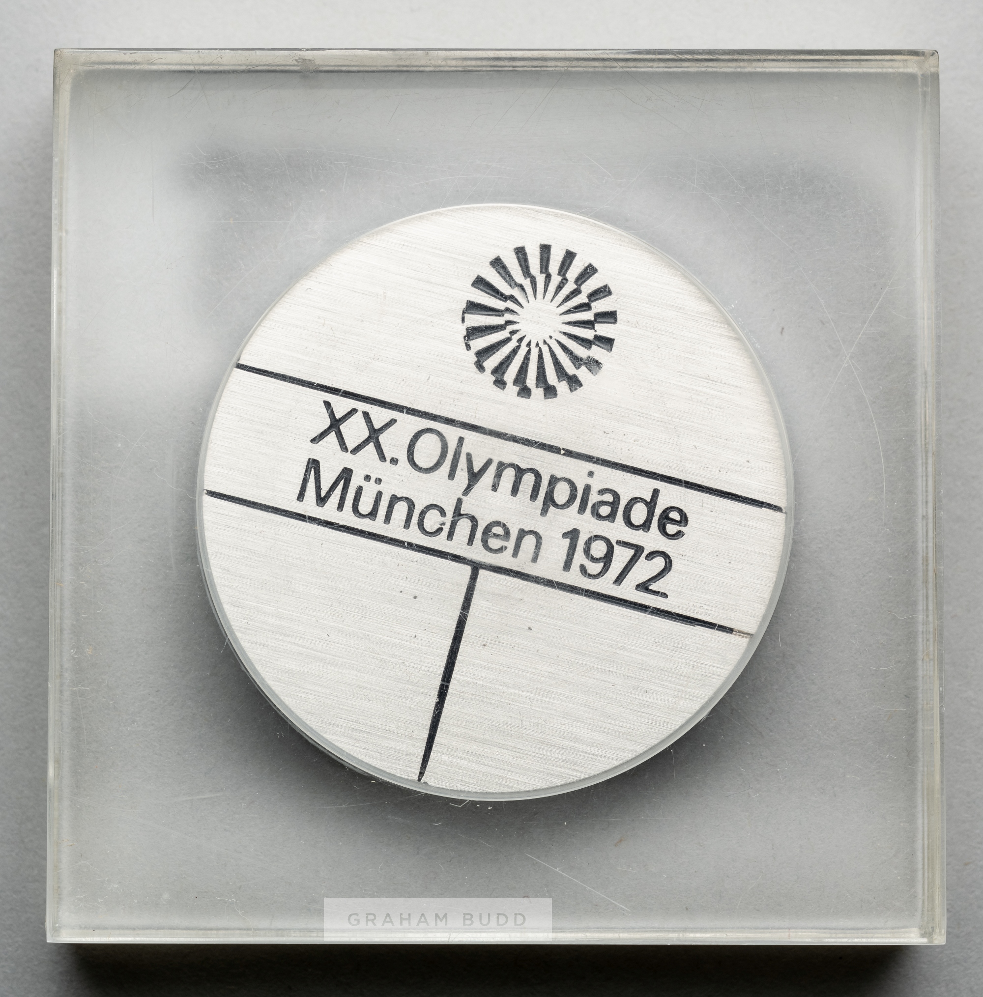 Munich 1972 Olympic Games participant's medal, designed by F. Konig, steel, obverse with Munich Olympic Games emblem of a wreath of rays of superimposed spiral above legend XX OLYMPIADE MUNCHEN 1972, reverse with Olympic Rings above two hands, one holding a laurel branch, diameter 49mm., encased in a sealed clear case, outer case bear surface wear