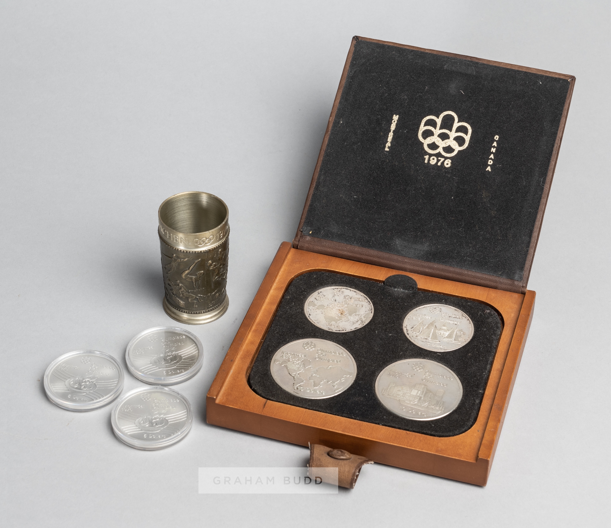 Munich 1972 and Montreal 1976 Olympic Games memorabilia, comprising 1972 squat liquor cup, with legend MUNCHEN 1972 with Olympic rings above an embossed band featuring athletics and sports persons for the Olympic events, base stamped REINZINN, 6.4 by 3.6cm., weight 104gms.; sold with three 1976 Montreal 5 dollar Canadian coins, obverse bearing the Olympic flame and legend OLYMPIADE XXI OLYMPIAD MONTREAL 1976 5 DOLLARS, reverse featuring Queen Elizabeth II and ELIZABETH II CANADA 1976, each in a plastic capsule; 1976 Montreal Olympic Games commemorative coin set, comprising two 10 dollar and two 5 dollar coins, each featuring Queen Elizabeth II with CANADA 1973, each reverse featuring legend OLYMPIADE XXI OLYMPIAD MONTREAL 1976 with city view or world map, diameter 10 dollar 45mm., 5 dollar 38mm., total weight 146gms., in a original fitted wooden and brown leather case, leather slightly faded on exterior, (qty)