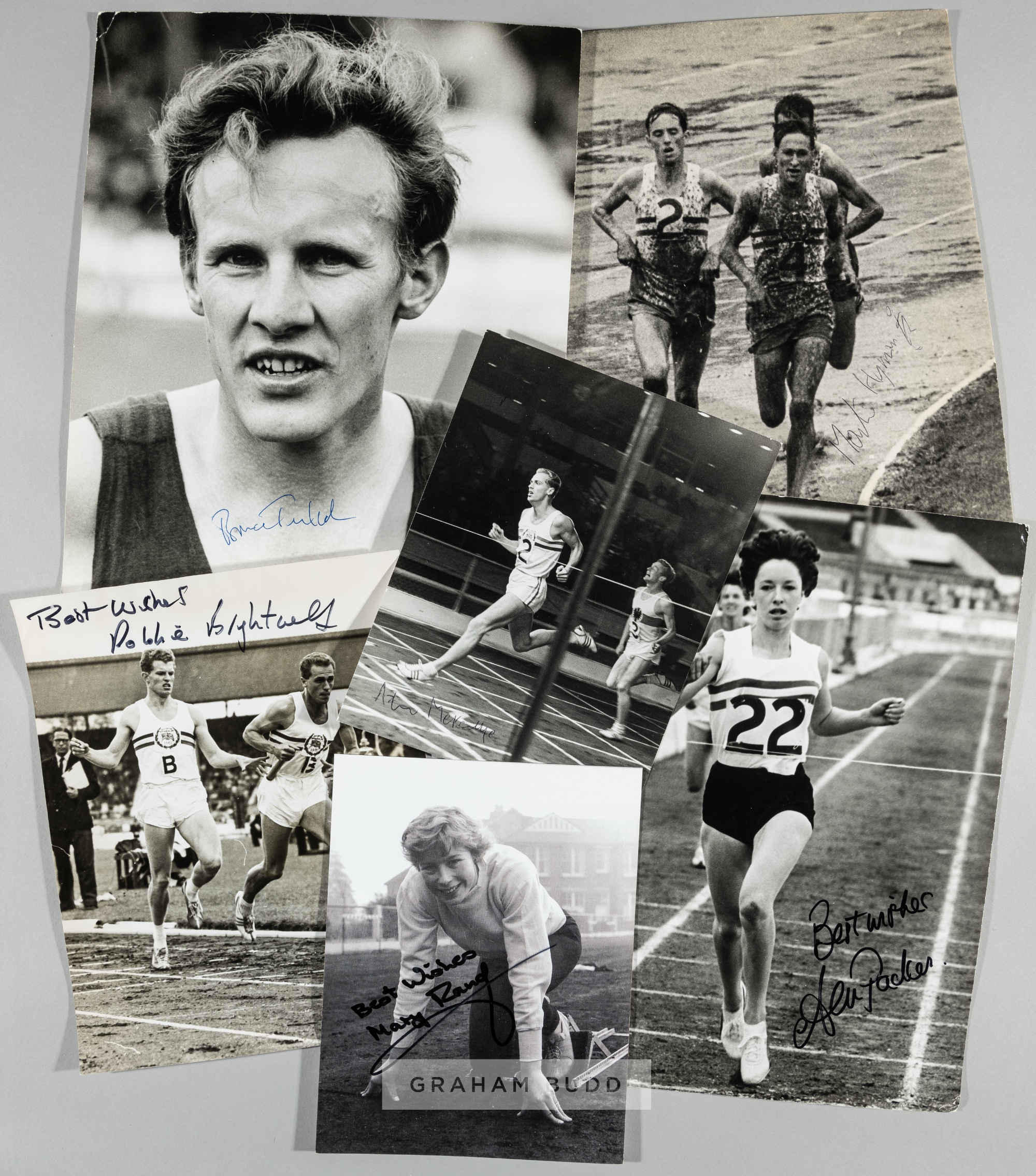 Selection of signed b&w action press photographs of British athletes, including Robbie Brightwell (5), Adrian Metcalfe, Martin Hymann, David Bedford, Bruce Tulloh (2), Anne Packer, Mary Rand and others and some signed photocopy photographs, (qty)