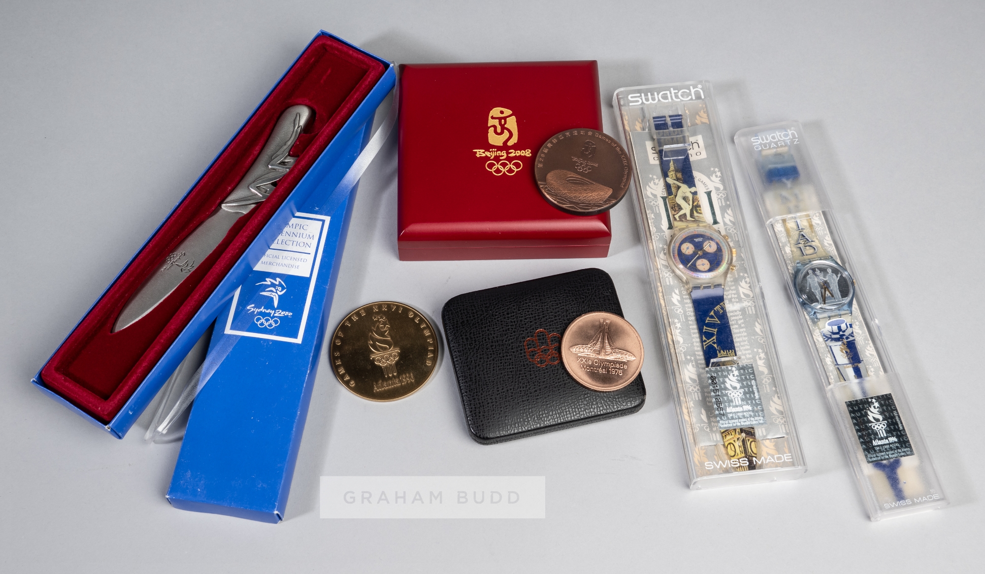 Participation medals for the Montreal 1976, Atlanta 1996 and Beijing 2008 Olympic Games, 1976 Montreal copper medal designed by G. Huel and P. Pelletier, obverse depicting Olympic Stadium above French legend in two lines, reverse with Olympic emblem M above Olympic Rings, diameter 45mm., weight 40gms., in original box; 1996 Atlanta bronze medal designed by M. Grear, obverse depicting official torch emblem inscribed GAMES OF THE XXVI OLYMPIAD ATLANTA 1996, reverse depicting a quilt of leaves, inscribed CENTENNIAL OLYMPIC GAMES, diameter 60mm., weight 57gms., no box included; 2008 Beijing copper medal, obverse depicting Olympic logo above the Bird's Nest Olympic Stadium, inscribed BEIJING 2008, reverse depicting five Fuwa mascots above Chinese and English 'ONE WORLD ONE DREAM' motto, diameter 54mm., weight 121gms., in original box; sold together with two Swatch watches commemorating the 1996 Atlanta Olympic Games and a 2000 Sydney Olympic Games commemorative pewter letter opener, the letter opener with stylized wave handle, engraved with Sydney Olympic Games emblem, length 17cm., in a fitted box, (6)