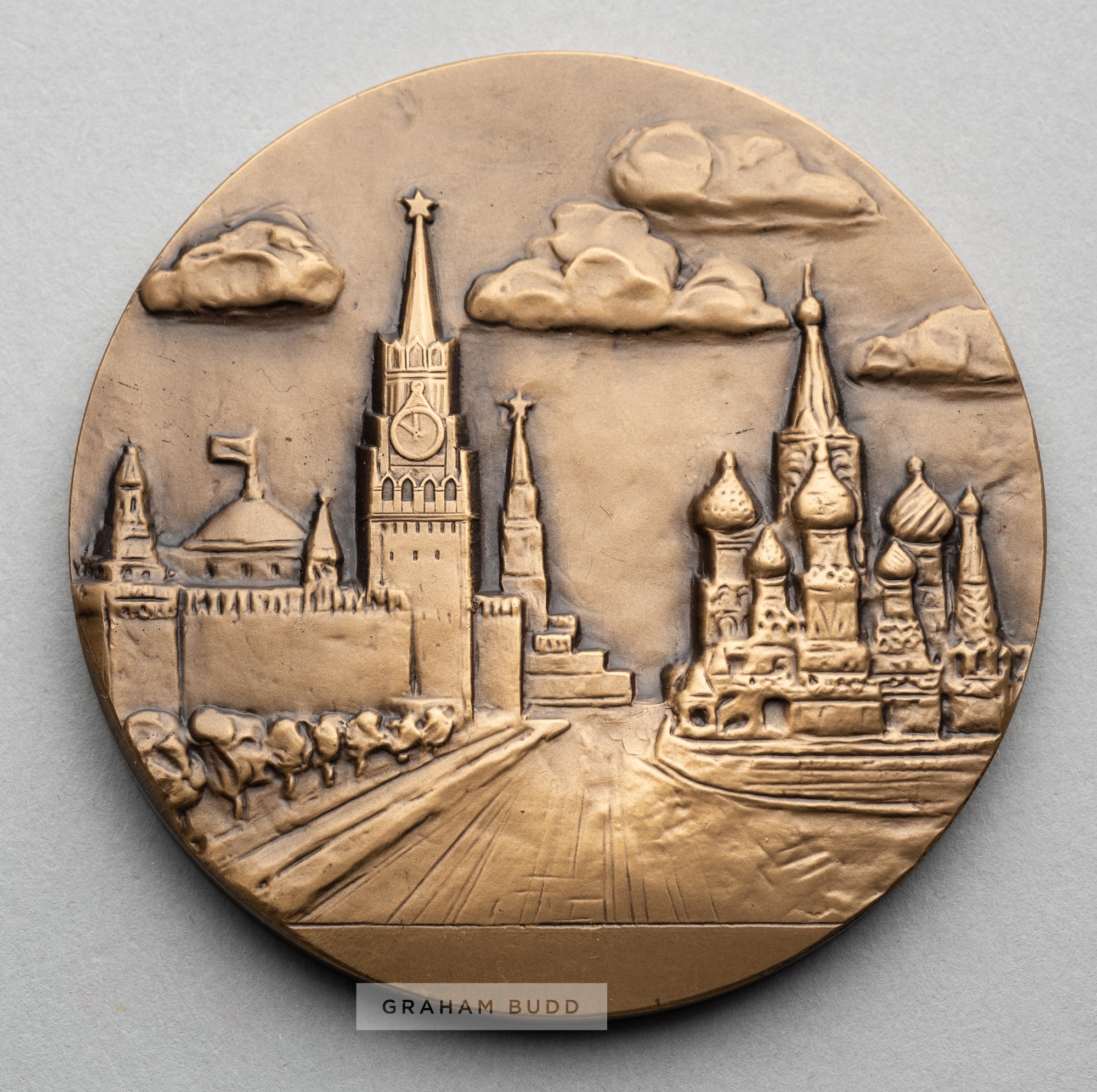 Moscow 1980 Olympic Games participant's medal, designed by A. Leonova, bronze, obverse depicting Moscow Olympic emblem above Olympic Stadium with legend in Russian, reverse with a view of the Red Square in Moscow, diameter 60mm., weight 111gms., in original fitted case