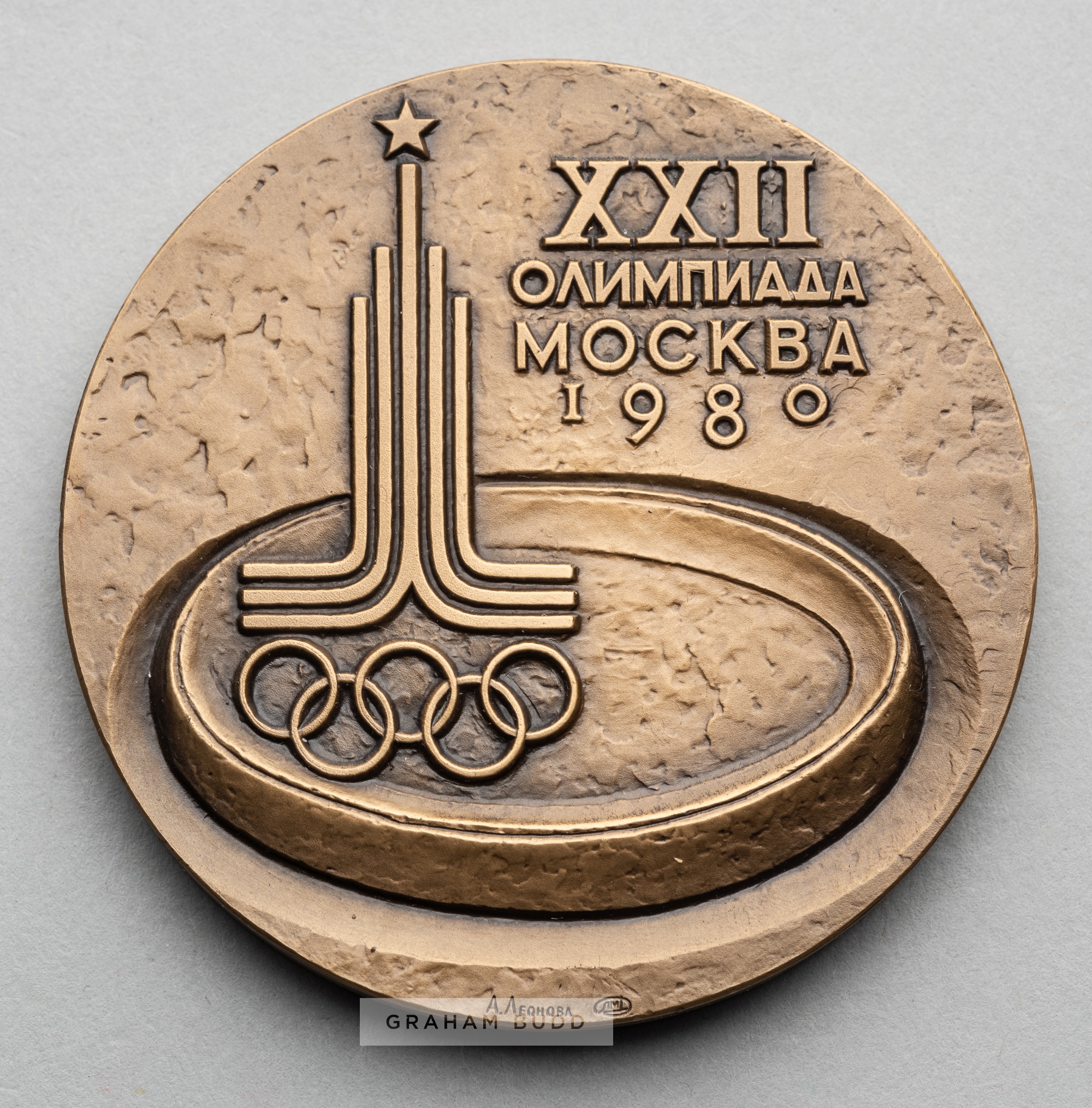 Moscow 1980 Olympic Games participant's medal, designed by A. Leonova, bronze, obverse depicting Moscow Olympic emblem above Olympic Stadium with leg