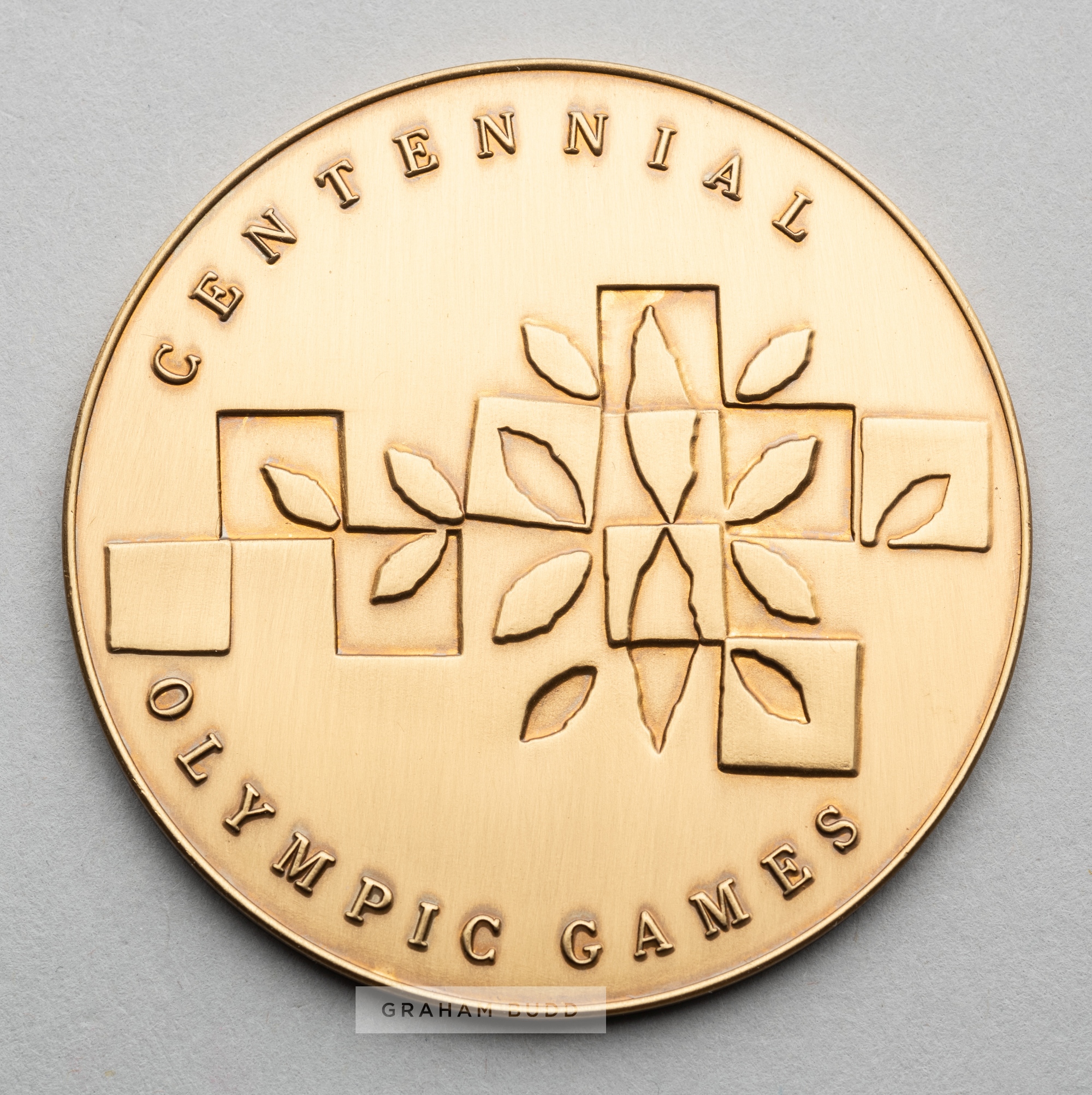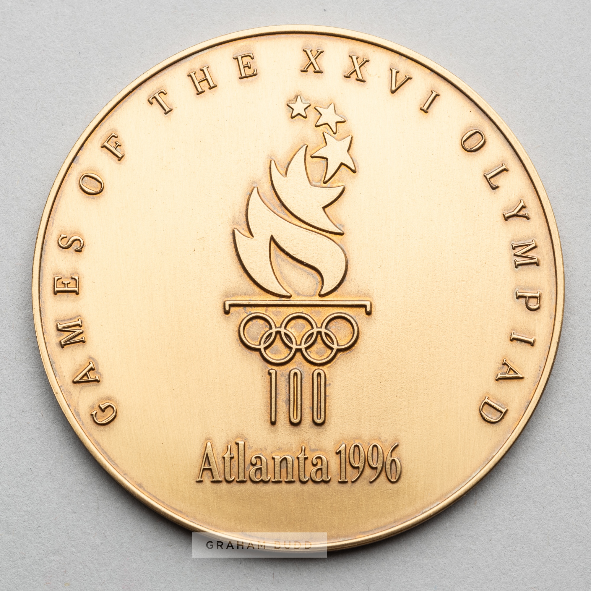 Atlanta 1996 Olympic Games participant's medal, designed by M. Grear, bronze, obverse with official torch logo with Olympic rings and legend GAMES OF THE XXVI OLYMPIAD 100 ATLANTA 1996, reverse with a quilt of leaves and legend CENTENNIAL OLYMPIC GAMES, diameter 60mm., weight 56gms., with original green felt pouch and case