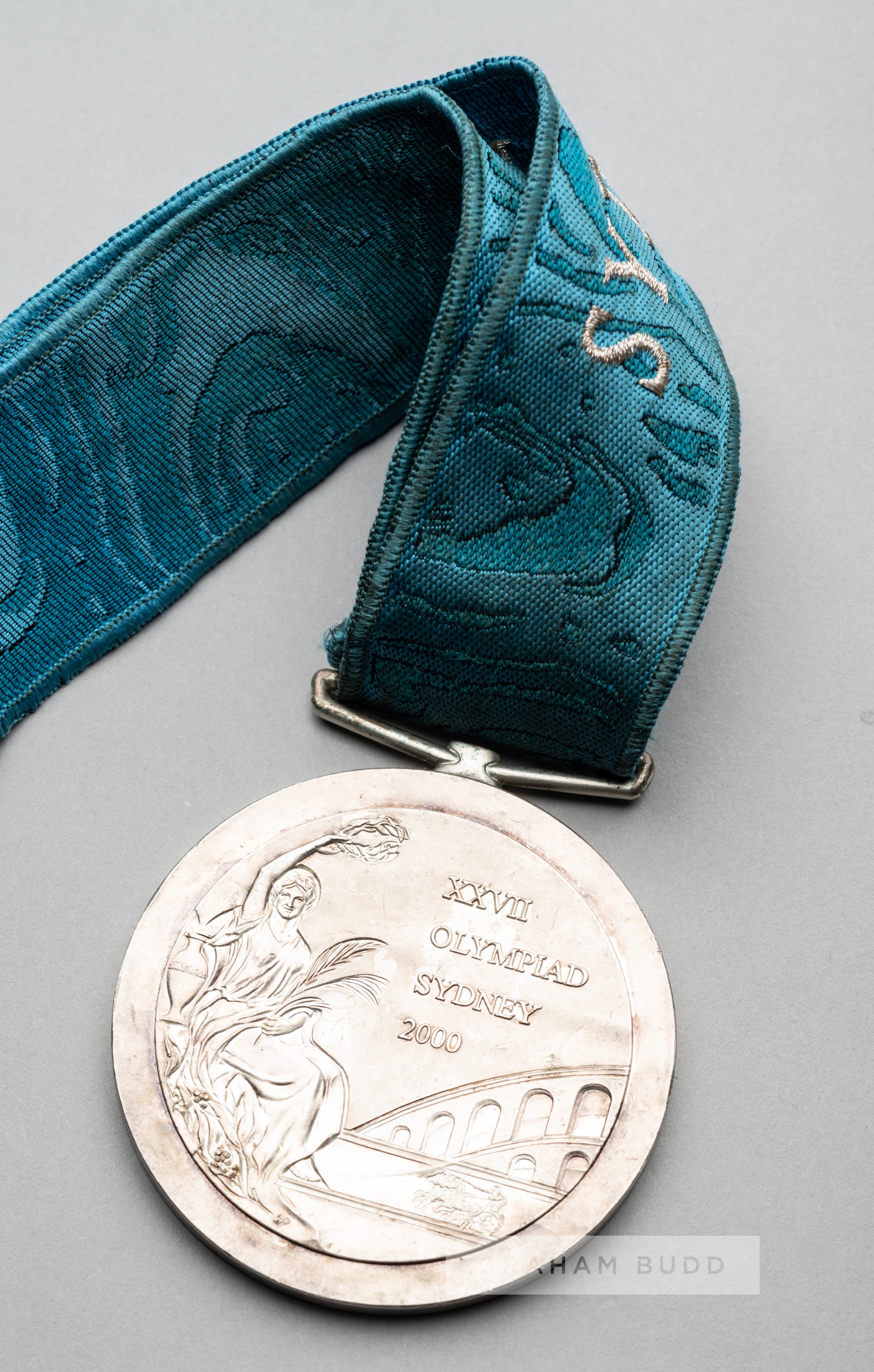 Sydney 2000 Olympic Games silver second prize medal for baseball, designed by Woljciech Pietrani and Brian Thompson, of circular form with suspension link and turquoise ribbon, obverse the goddess Nike holding a wreath seated above a stadium and a fragment of the Colosseum, inscribed XXVII OLYMPIAD SYDNEY 2000, reverse with the Olympic rings over Sydney opera house and Sydney torch, engraved BASEBALL, turquoise ribbon lettered SYDNEY 2000, weight 182gr., diameter 68mm., ribbon bears some staining and minor wear to the medal Cuba won Silver in the Men's baseball competition in the 2000 Sydney Olympic Games.