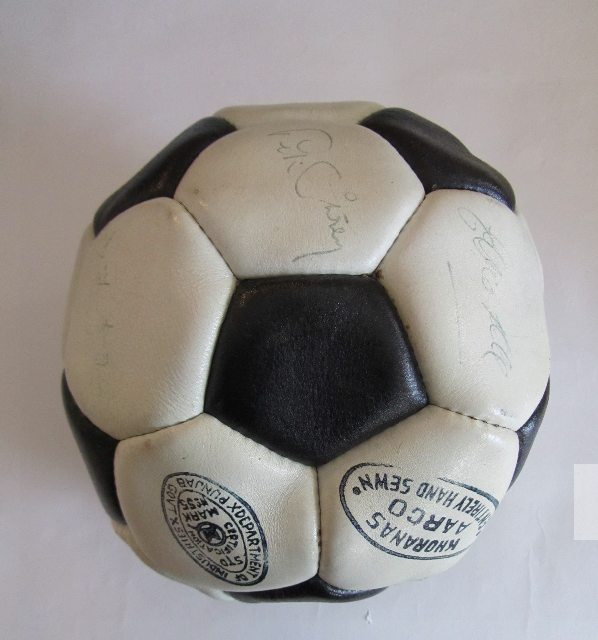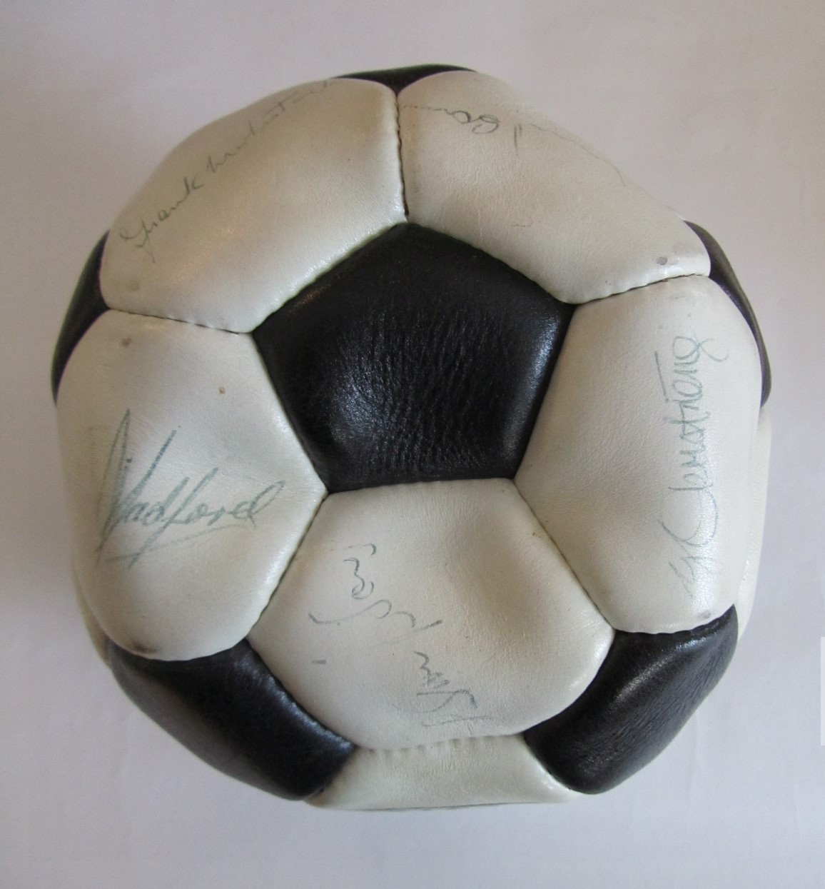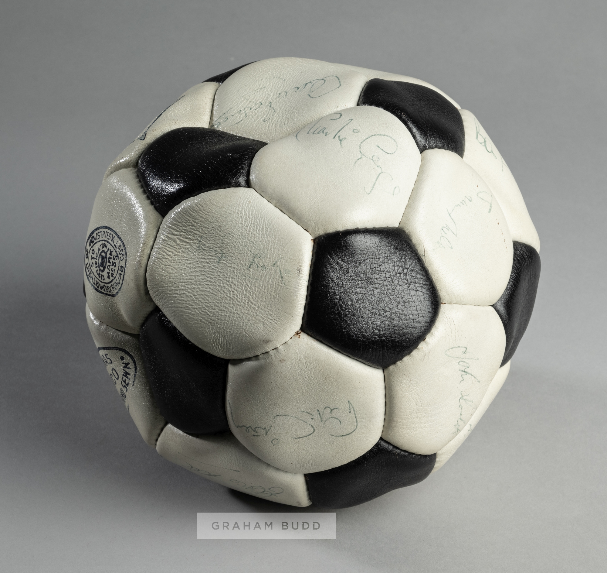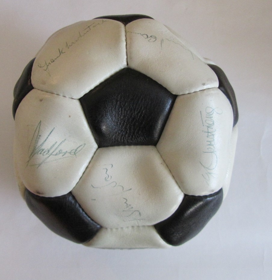 FOOTBALL - ARSENAL 1970-71 DOUBLE WINNERS CONTEMPORAY AUTOGRAPHED FOOTBALL INDIVIDUALLY SIGNED TO EACH PANEL BY THE ARSENAL DOUBLE WINNING SQUAD. SIXTEEN (16) INK SIGNATURES INCLUDING: FRANK McLINTOCK, GEORGE GRAHAM, RAY KENNEDY, GEORGE ARMSTRONG, BOB WILSON, BOB McNAB, PETER MARINELLO, CHARLIE GEORGE, PETER SIMPSON, PAT RICE, JOHN RADFORD, SAMMY NELSON, PETER STOREY, EDDIE KELLY, JOHN ROBERTS AND GEOFF BARNETT. VERY GOOD CONDITION.