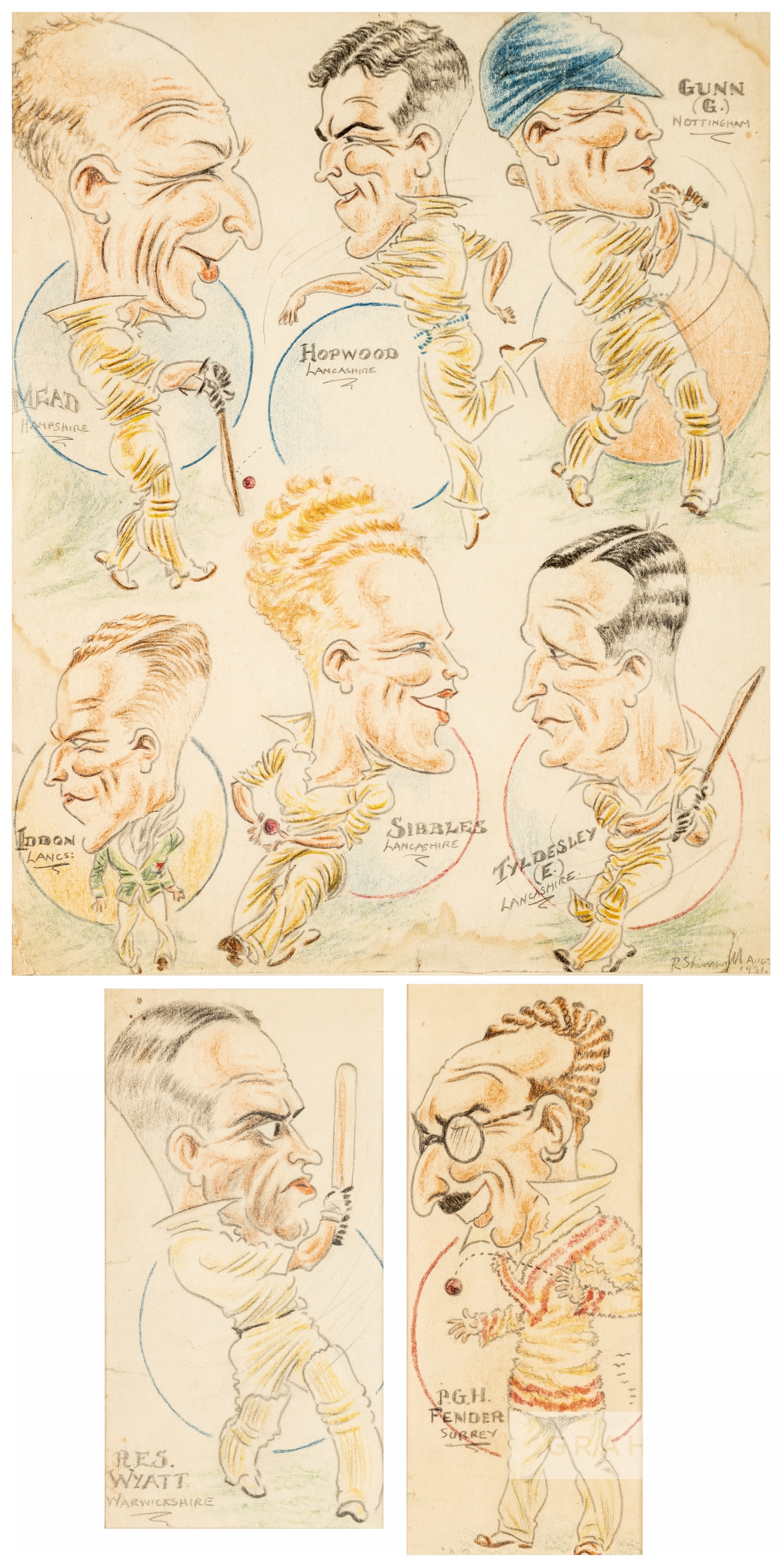 Two cricket caricatures by Shinwell, circa 1925, the first pen and watercolour depicting Surrey's Percy G.H. Fender, mounted, glazed and framed, overall 34 by 25cm.; the second crayon, pencil and watercolour depicting England's Robert E.S Wyatt, mounted, glazed and framed, overall 34 by 25cm.; sold together with a third caricature depicting six cricketers including Hampshire's Mead, Lancashire's Hopwood, Nottingham's G. Gunn, Lancashire's Iddon, Sibbles and E. Tyldesley, signed and dated lower right margin August 1934, mounted, glazed and framed, overall 46 by 39cm., (3) Please be aware all glass will be removed from framed and glazed items prior to posting and may result in delays to shipping your items. (This service is included in the cost of postage and packing). We can also totally remove all framing and mounts upon request to reduce shipping costs. Alternatively lots can be collected in person by prior appointment from NN8 1RT.