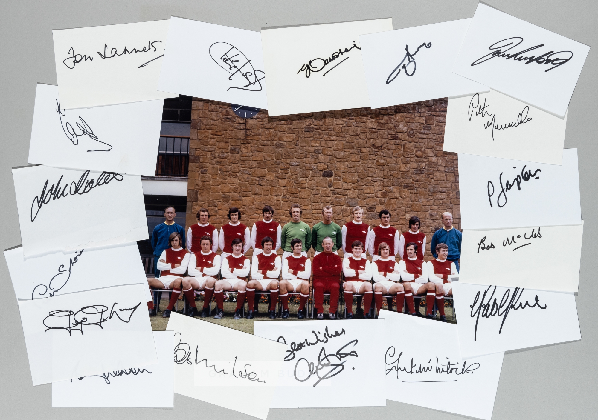 Arsenal double-winners 1970-71 team photograph with individually signed cards, signed in black marker pen by all 17 players, (18)