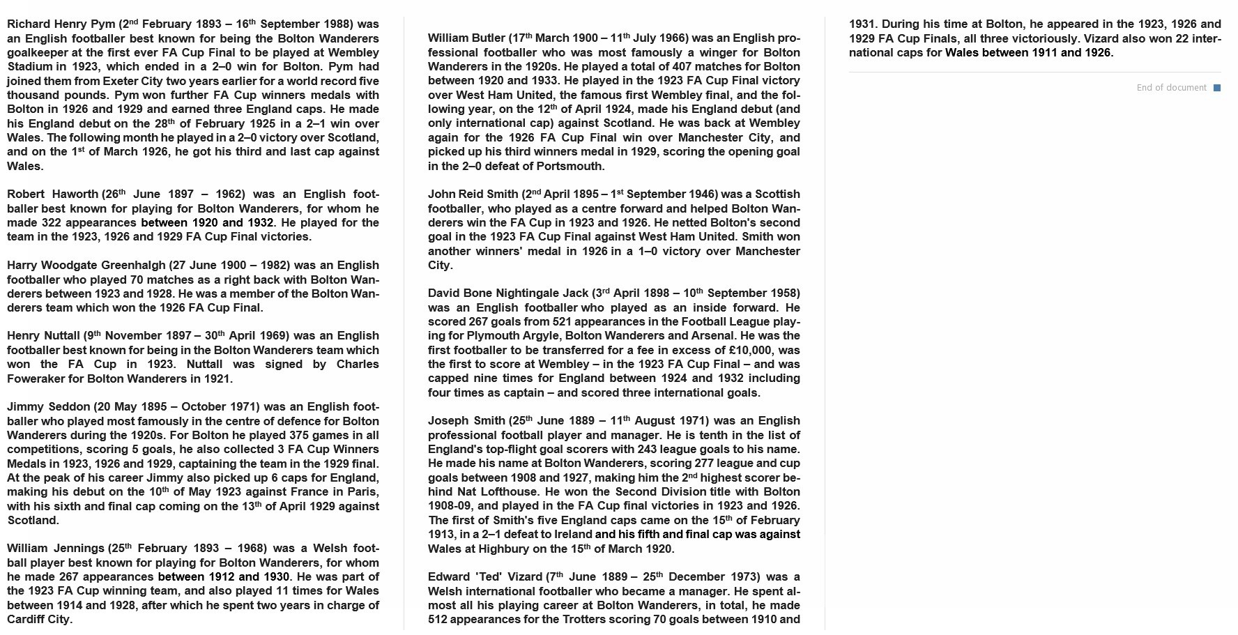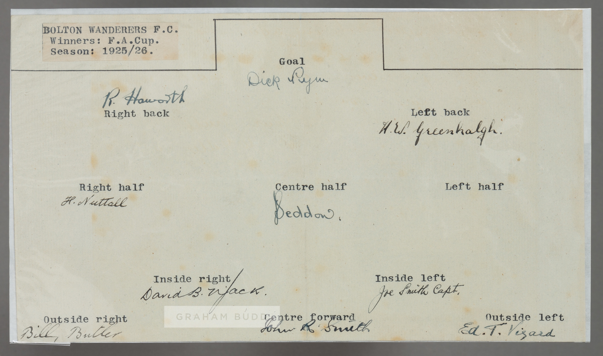 FOOTBALL - BOLTON WANDERERS 1925-26 FA CUP WINNING TEAM ORIGINAL INK AUTOGRAPHED TEAM SHEET The 1926 FA Cup Final was between Bolton Wanderers and Manchester City on the 24th of April 1926 at Wembley Stadium in London, it was the 55th final, and the fourth at Wembley. Bolton entered the match as favourites and, as expected, went on to win the match 1-0, their single goal being scored by the mercurial David Jack. RARE ORIGINAL AUTOGRAPHED SHEET OF PAPER SIZE 8 ¾” x 5” WITH TYPED TEAM GRID AUTOGRAPHED IN FOUNTAIN PEN INK TO THEIR INDIVIDUAL TEAM POSITIONS BY THE BOLTON WANDERERS F.C 1925-26 FA CUP WINNING TEAM, THE FOURTH WEMBLEY WINNERS. AUTOGRAPHED BY THE TEN OF THE BOLTON ELEVEN, SIGNATURES INCLUDE: DICK PYM, BOB HAWORTH, HARRY GREENHALGH, HENRY NUTTALL, JIMMY SEDDON, BILLY BUTLER, DAVID JACK, JOHN. R SMITH, JOSEPH SMITH AND TED VIZARD. (MISSING THE SIGNATURE OF BILLY JENNINGS). VERY GOOD CONDITION. FORMERLY FROM THE COLLECTION OF EARLY 20TH CENTURY AUTOGRAPH COLLECTOR LOUIS B. FREWER. Please see extra image for further details about this lot.