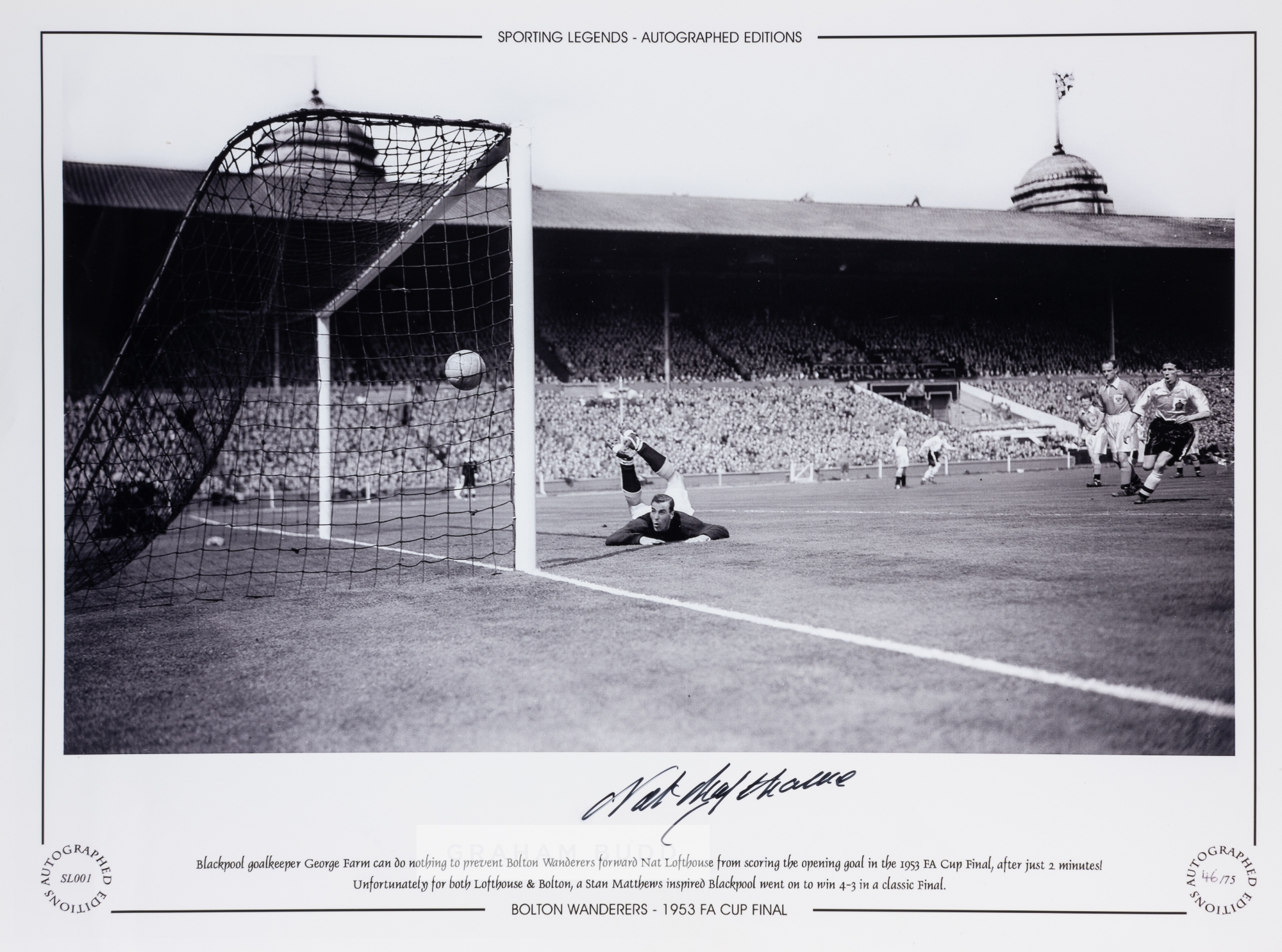 FOOTBALL - Bolton Wanderers 1953 F.A Cup final Nat Lofthouse large 16 by 12in. autographed Limited Edition display photograph: Superb large signature of Nat Lofthouse to the lower clear white border. Lofthouse scoring the opening goal of the 1958 F.A Cup final.