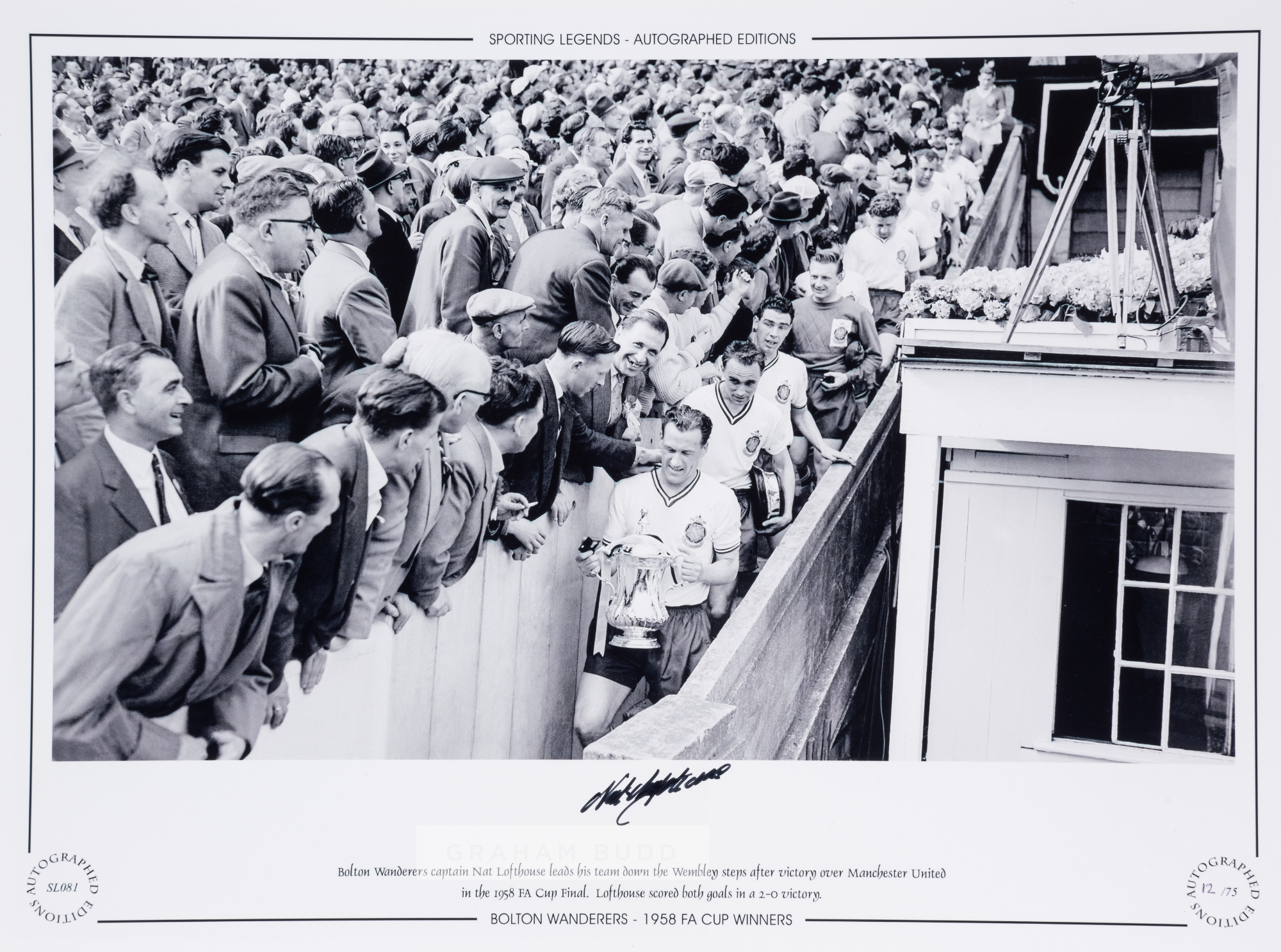 FOOTBALL - Bolton Wanderers 1958 F.A Cup winner Nat Lofthouse large 16 by 12in. autographed Limited Edition display photograph: Nat Lofthouse carrying the F.A Cup down the Wembley steps with the trophy having scored both goals in Bolton’s 2-0 victory over Manchester United, with smaller authentication photograph depicting Nat Lofthouse signing the image. Superb large signature of Nat Lofthouse to the lower clear white border.