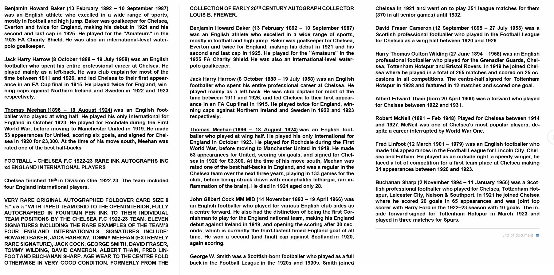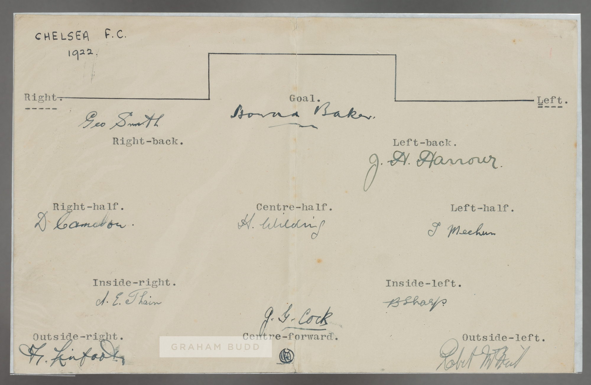 FOOTBALL - CHELSEA F.C 1922-23 RARE INK AUTOGRAPHS INC x4 ENGLAND INTERNATIONAL PLAYERS Chelsea finished 19th in Division One 1922-23. The team included four England International players. VERY RARE ORIGINAL AUTOGRAPHED FOLDOVER CARD SIZE 8 ½” x 5 ½” WITH TYPED TEAM GRID TO THE OPEN INTERIOR, FULLY AUTOGRAPHED IN FOUNTAIN PEN INK TO THEIR INDIVIDUAL TEAM POSITIONS BY THE CHELSEA F.C 1922-23 TEAM. ELEVEN SIGNATURES INCLUDING THE RARE EXAMPLES OF THE TEAM’S FOUR ENGLAND INTERNATIONALS. SIGNATURES INCLUDE: HOWARD BAKER, JACK HARROW, TOMMY MEEHAN (EXTREMELY RARE SIGNATURE), JACK COCK, GEORGE SMITH, DAVID FRASER, TOMMY WILDING, DAVID CAMERON, ALBERT THAIN, FRED LINFOOT AND BUCHANAN SHARP. AGE WEAR TO THE CENTRE FOLD OTHERWISE IN VERY GOOD CONDITION. FORMERLY FROM THE COLLECTION OF EARLY 20TH CENTURY AUTOGRAPH COLLECTOR LOUIS B. FREWER. Please see extra image for further details about this lot.