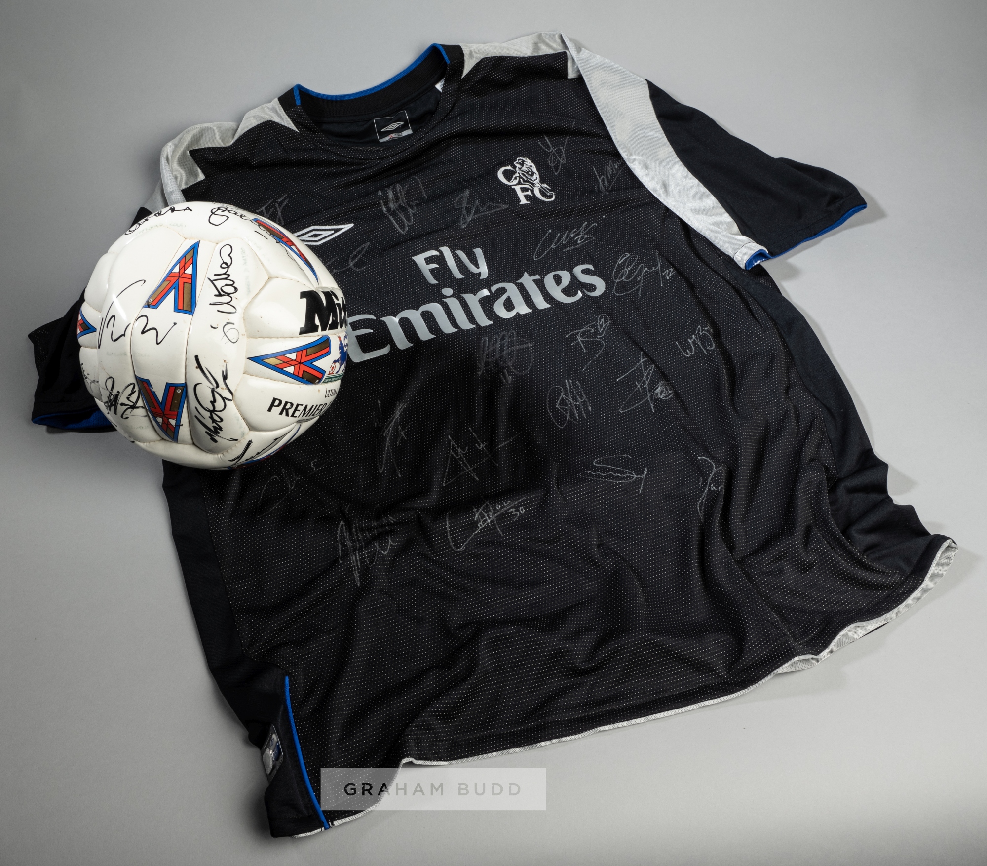 Squad signed Damien Duff Chelsea no.11 replica away jersey, season 2004-05, black and grey jersey with embroidered club crest and sponsor logo, reverse lettered DUFF, signed by approximately 22 squad members in silver marker pen including Damien Duff, Frank Lampard, Eiour Guojohnsen, Wayne Bridge, Arjen Robben, Ricardo Carvalho, and others, sold together with a Chelsea legends signed Mitre Premier League football, signed in black marker pen with faintly handwritten players names under the signatures, including Roberto Di Matteo, Steve Clarke, Tore Andre Flo, Graham Rix and many more, (2)