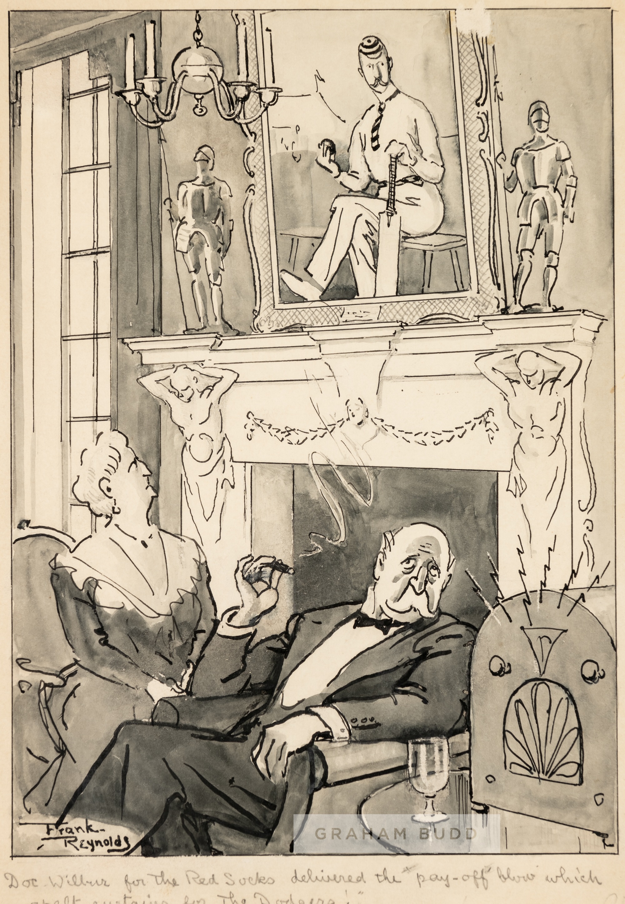 Frank Reynolds (British, 1876-1953) artwork of an English gentleman cricketer who appears to have adopted an interest in American baseball, circa 1940s, Pen, ink wash original artwork with caption below DOC WILBUR FOR THE RED SOCKS DELIVERED THE PAY-OFF BLOW WHICH SPELT CURTAINS FOR THE DODGERS, signed lower left, mounted, glazed and framed, overall size 39 by 31cm. Possibly for Punch magazine. Please be aware all glass will be removed from framed and glazed items prior to posting and may result in delays to shipping your items. (This service is included in the cost of postage and packing). We can also totally remove all framing and mounts upon request to reduce shipping costs. Alternatively lots can be collected in person by prior appointment from NN8 1RT.