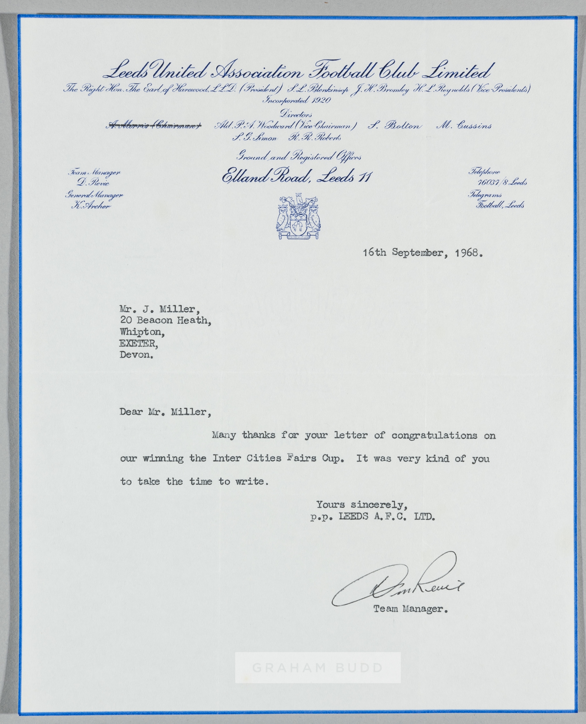Leeds United letter signed by manager Don Revie, 16th September 1968, on embossed letterhead thanking a fan for his letter of congratulations on winning the Inter Cities Fairs Cup