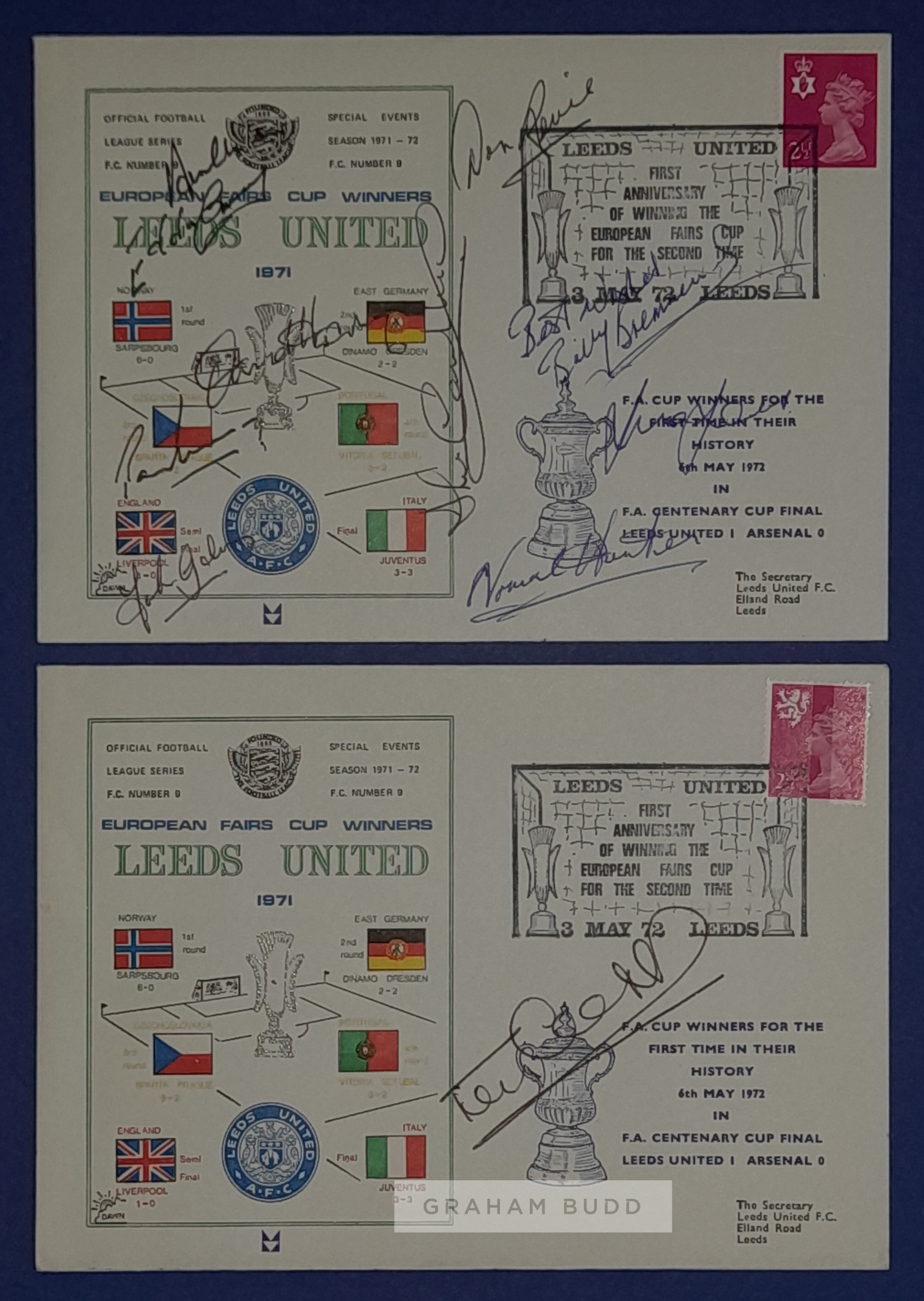 Leeds United signed First Day Covers, both are from the official football league series of special events season 1971-72 these being F.C. no.9, both celebrate Leeds being European Fairs Cup winners in 1971 and FA Cup winners in 1972. One is signed by just Terry Cooper whilst the second is signed by manager Don Revie, Allan Clarke, Eddie Gray, David Harvey, Peter Lorimer, Johnny Giles, Jack Charlton, Billy Bremner, Mick Jones and Norman Hunter, (2)