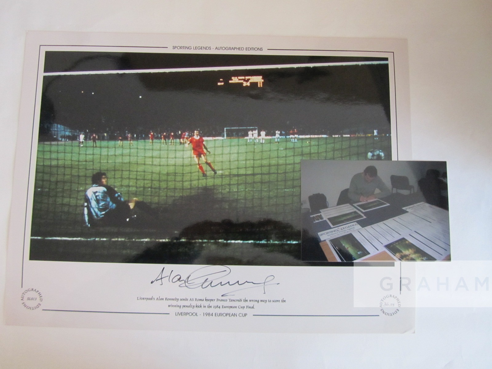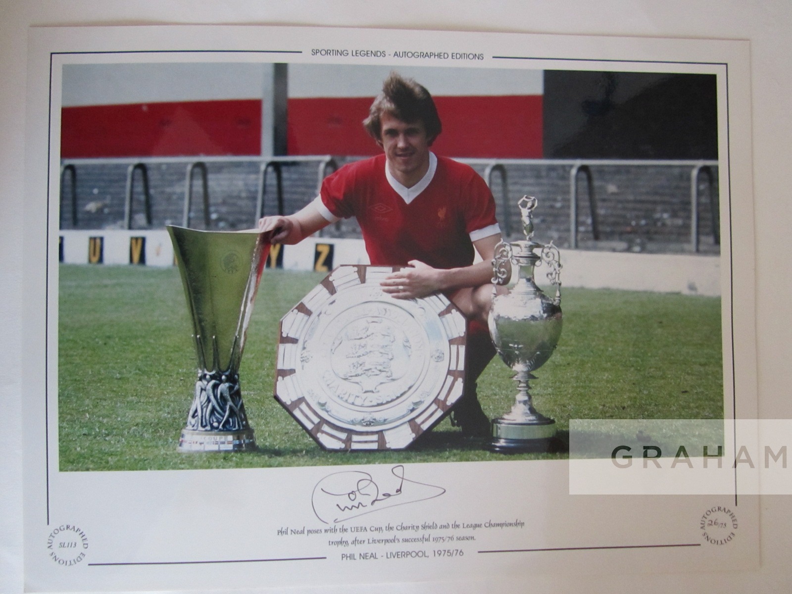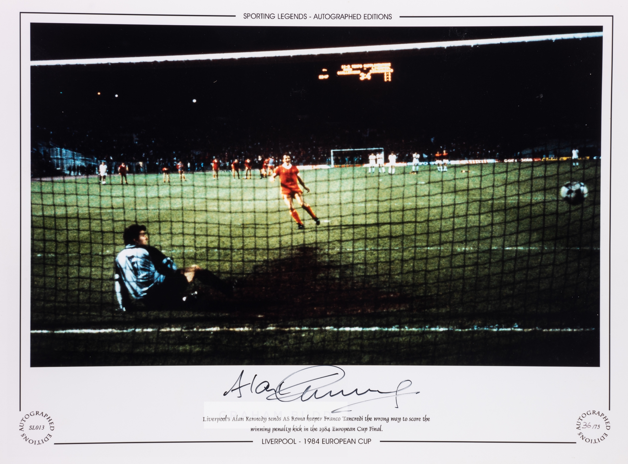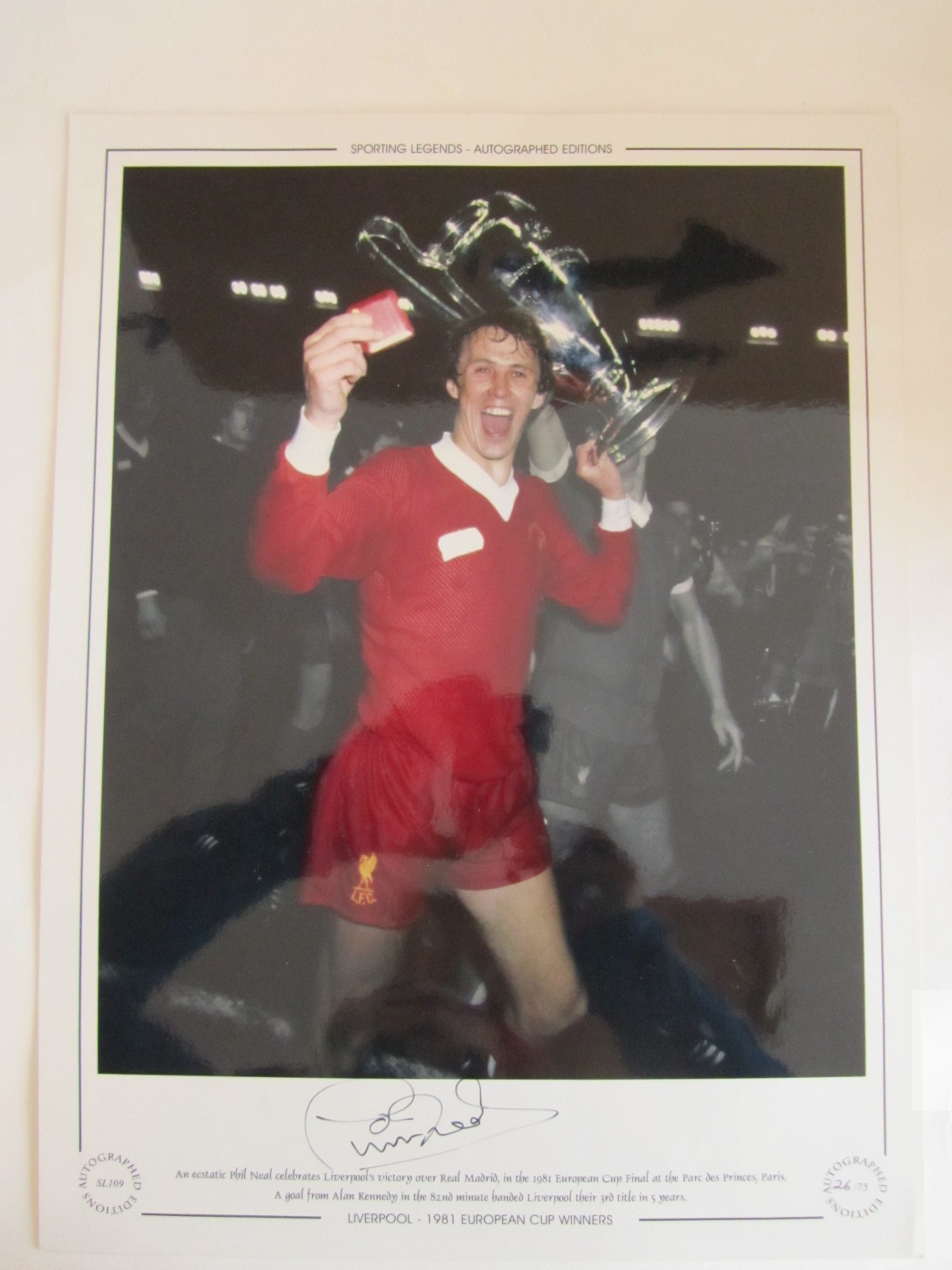 FOOTBALL - Liverpool Alan Kennedy and Phil Neal – x3 Large 16 by 12in. signed Limited Edition display photographs: Alan Kennedy Ltd Ed No 36/75 1984 European cup final with smaller authentication photograph depicting Kennedy signing the image. Phil Neal Ltd Ed No 26/751975-76 with three trophies. Phil Neal Ltd Ed No 26/75 1981 European Cup Final. Both images superbly autographed with large original signatures.