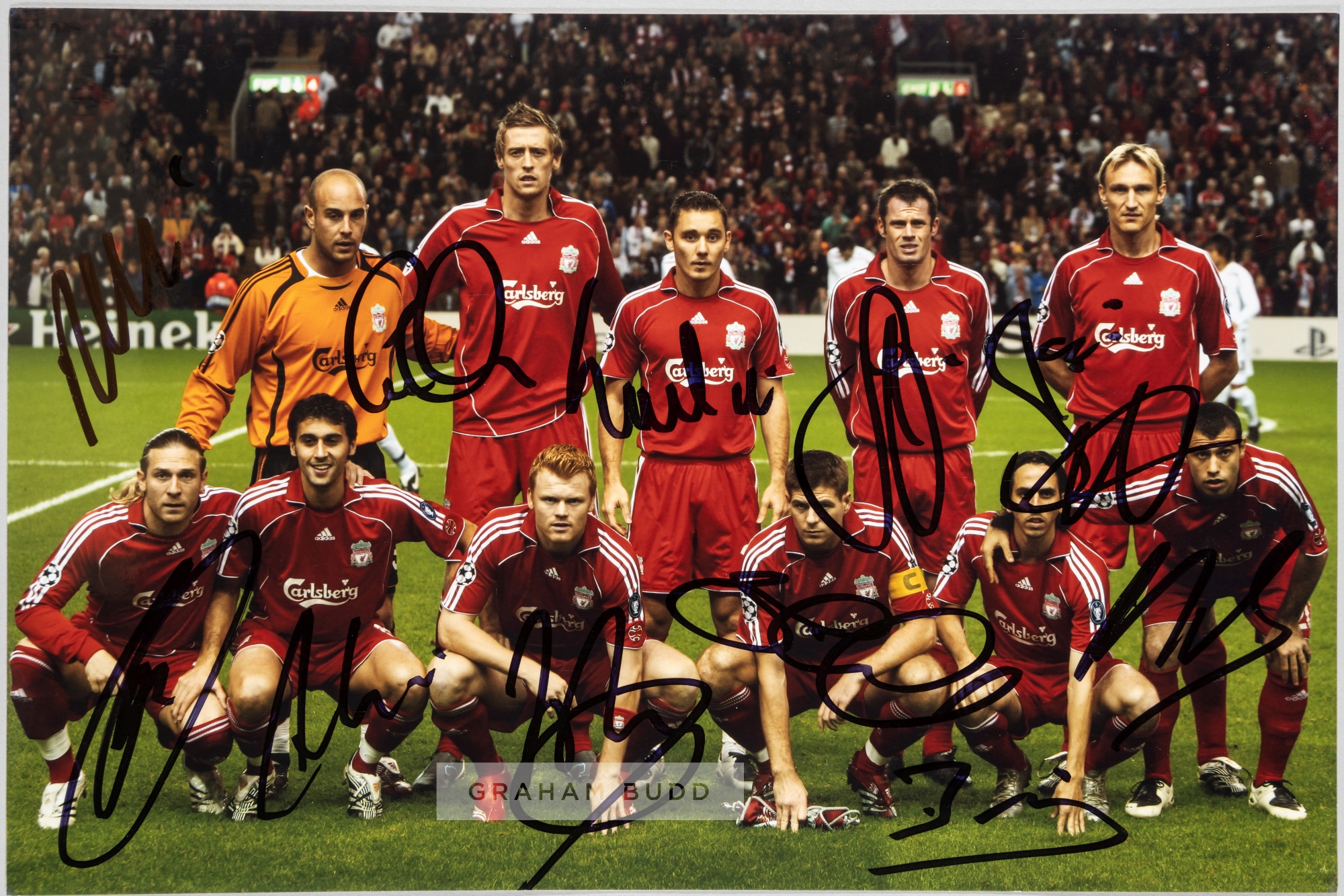 FOOTBALL - LIVERPOOL 2008 ORIGINAL FULLY AUTOGRAPHED TEAM PHOTOGRAPH. EXCELLENT COLOUR 12” x 8” PHOTOGRAPH, DEPICTING A LIVERPOOL TEAM LINE-UP FROM 2008 IN USUAL STANDING AND SQUATTING TEAM FORMATION, FULLY AUTOGRAPHED IN BLACK INK BY ALL ELEVEN PLAYERS DEPICTED INCLUDING: STEVEN GERARD, SAMI HYYPIA, JAMIE CARRAGHER, JOHN ARNE RIISE, PEPE REINA, YOSSI BENAYOUN, PETER CROUCH ET AL. EXCELLENT CONDITION.