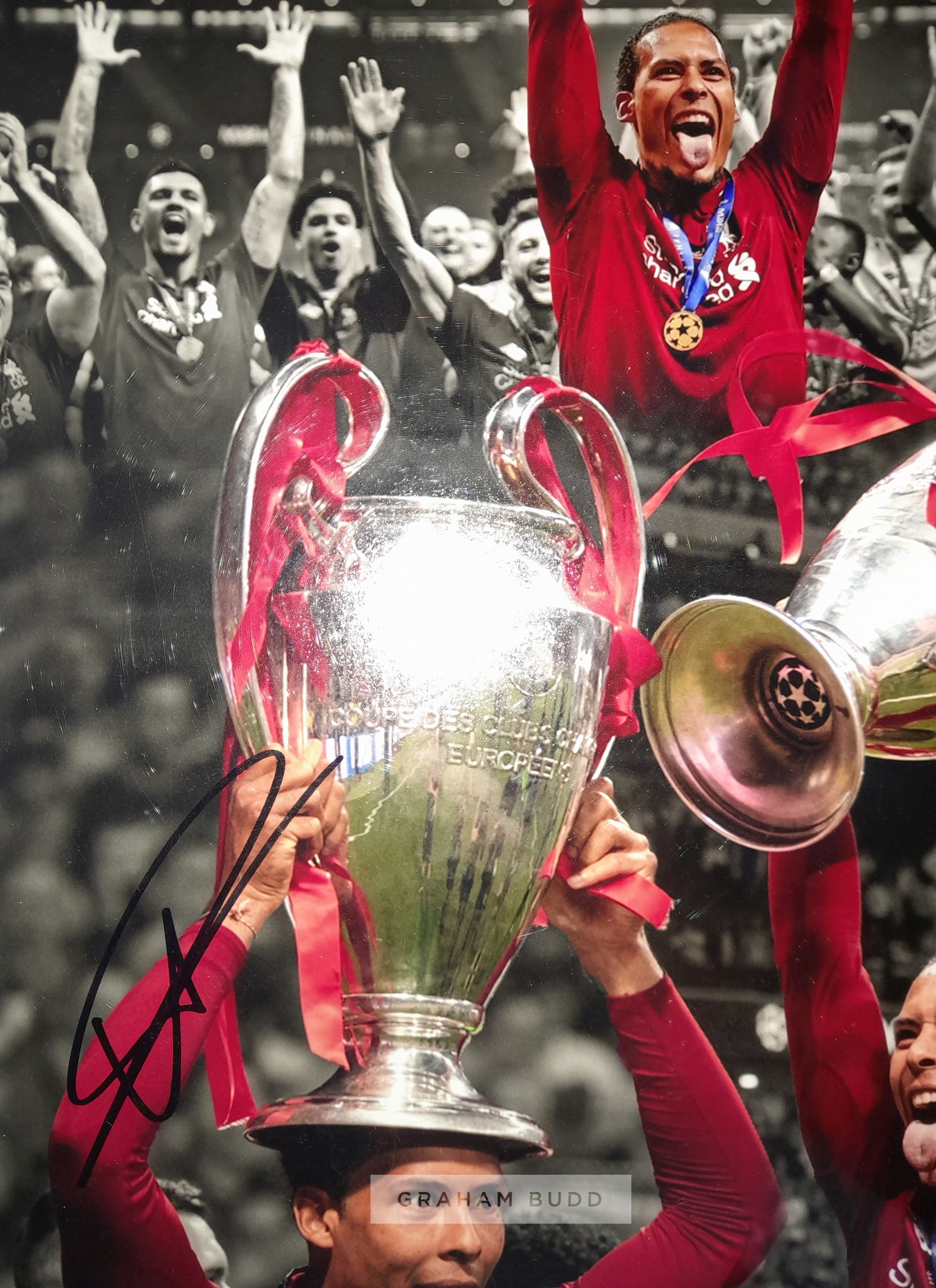 Liverpool captain Virgil Van Dijk hand autographed Champions League winners montage, measures 41 by 31.5cm., mounted and framed with acrylic front ra