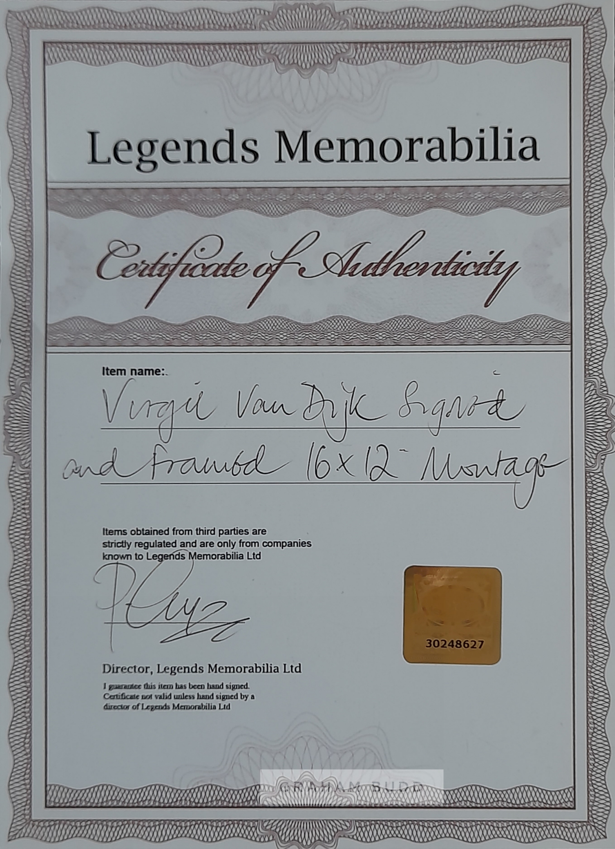 Liverpool captain Virgil Van Dijk hand autographed Champions League winners montage, measures 41 by 31.5cm., mounted and framed with acrylic front rather than glass, measures overall 50 by 39cm., comes with COA from reputable company Please be aware all glass will be removed from framed and glazed items prior to posting and may result in delays to shipping your items. (This service is included in the cost of postage and packing). We can also totally remove all framing and mounts upon request to reduce shipping costs. Alternatively lots can be collected in person by prior appointment from NN8 1RT.