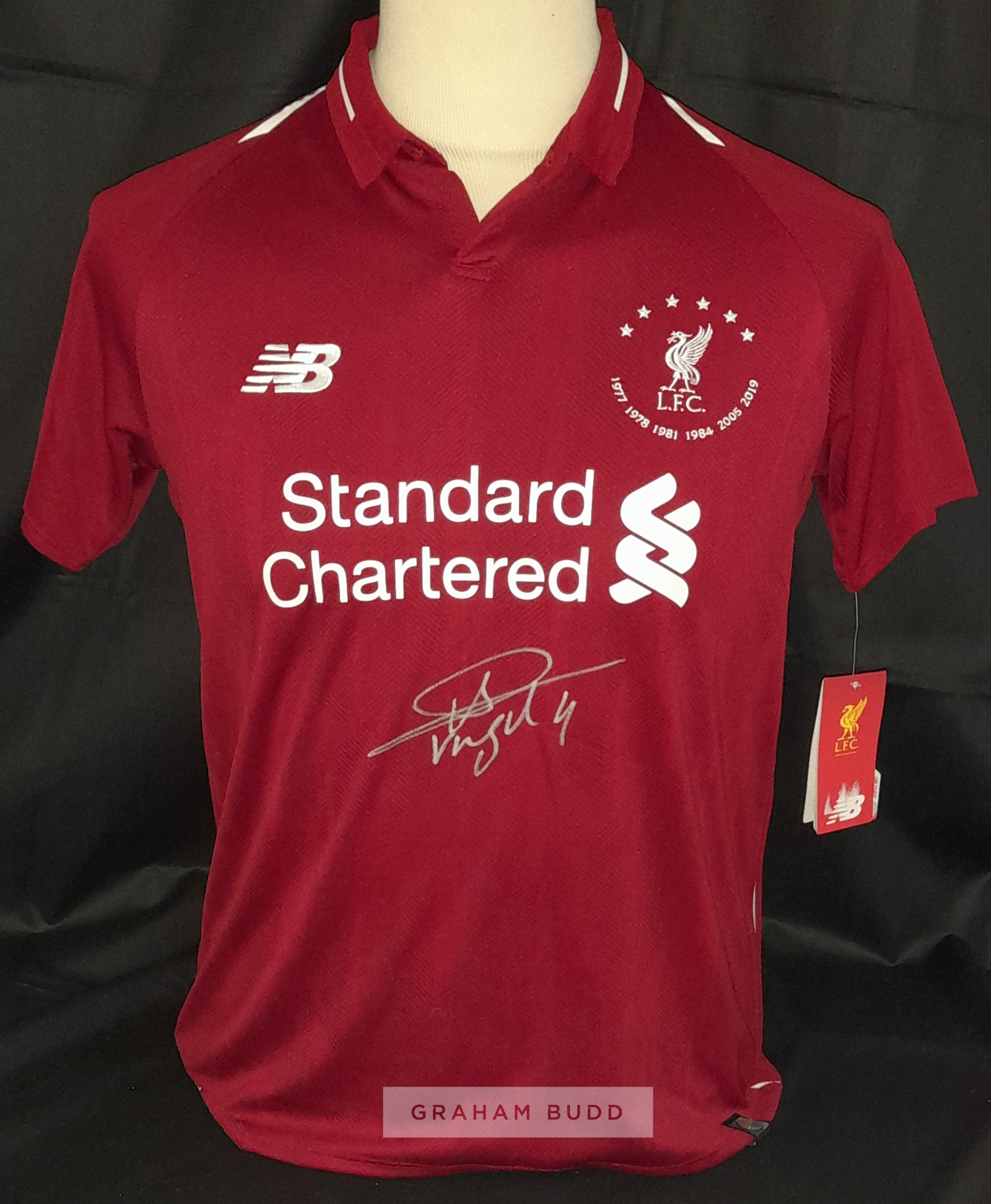 Virgil Van Dijk Liverpool signed 2018-19 Liverpool jersey special edition, with six Champions League winners embroidered around the crest, brand new with official Liverpool merchandise tags still attached, comes with COA and photo proof