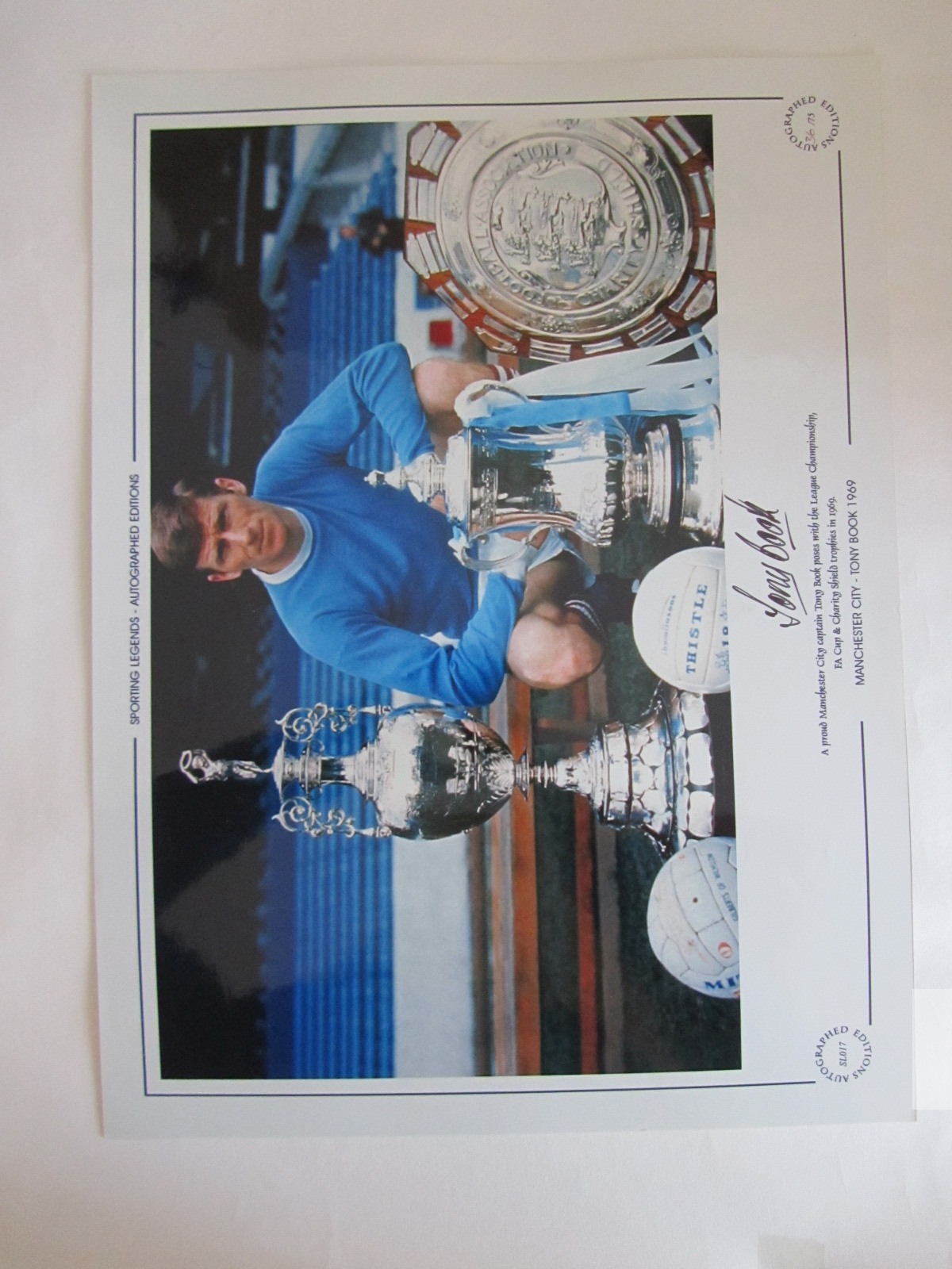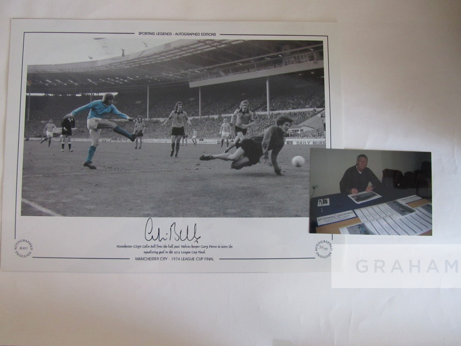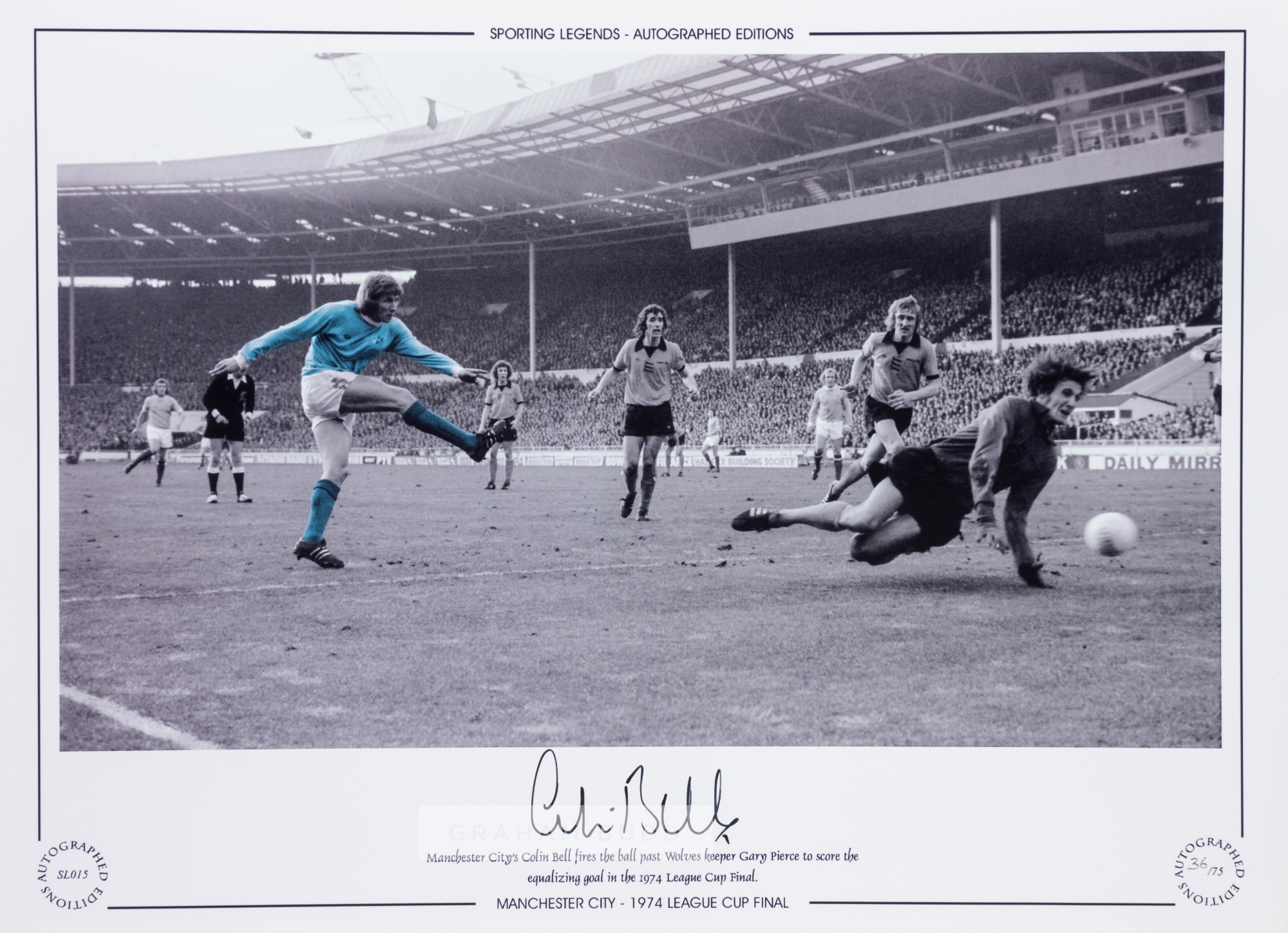 FOOTBALL - Manchester City Colin Bell – Large 16”x12” signed Limited Edition display photograph: Colin Bell Ltd Ed No 36/75 scoring the equalizer in the 1974 League Cup Final with smaller authentication photograph depicting Colin Bell signing the image. The image superbly autographed with large original signature. Manchester City Tony Book and Mike Summerbee – Pair of large 16” x 12” signed Limited Edition photographs: Tony Book 1969 Posing with the League Championship trophy, F.A Cup and Charity Shield trophies. Ltd Ed No 36/75 Mike Summerbee large 16”x12” beautifully signed display photograph: All three images superbly autographed with large original signatures.
