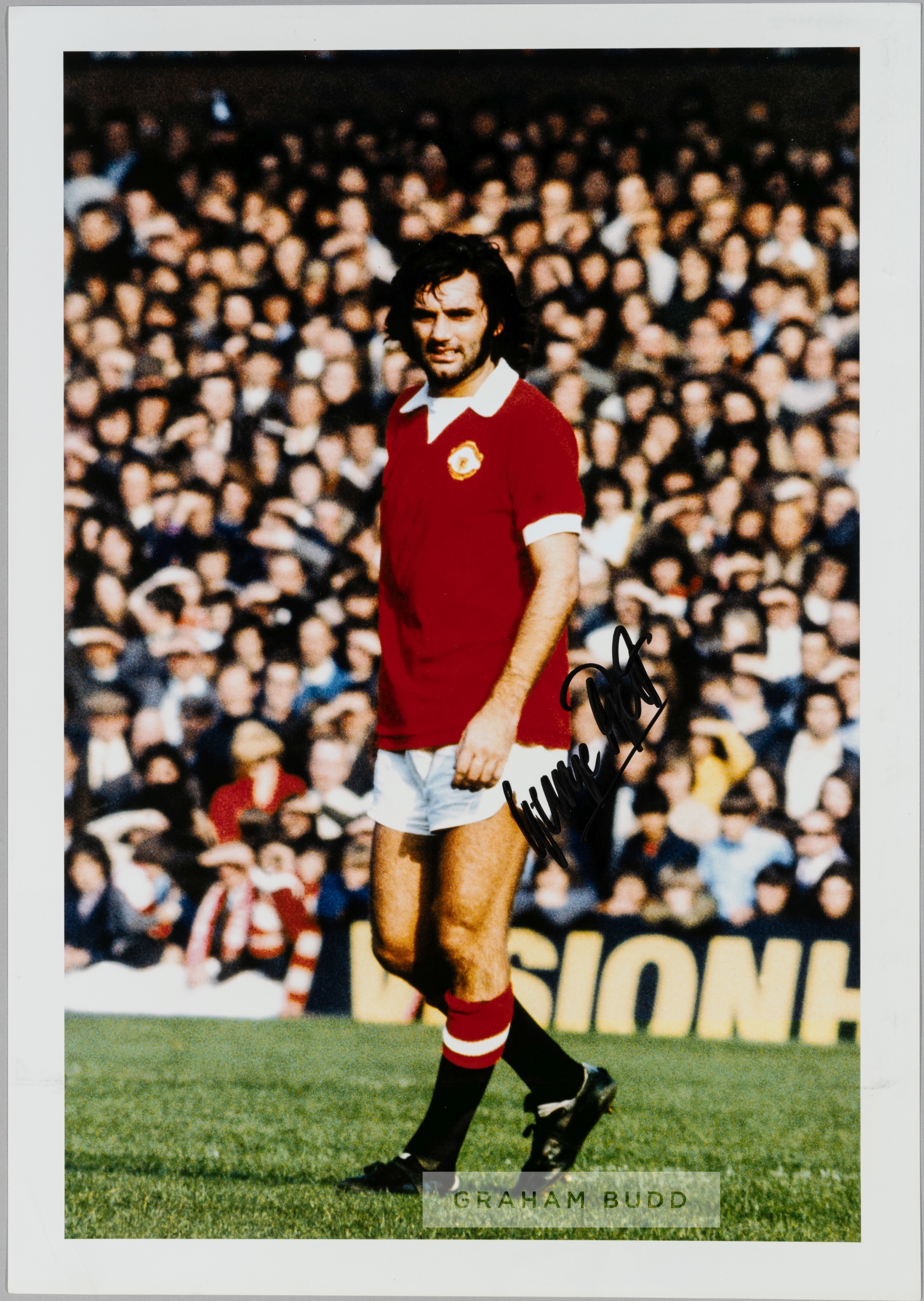 FOOTBALL - GEORGE BEST MANCHESTER UNITED CIRCA 1968 16 ½” x 11 ¾” ORIGINAL AUTOGRAPHED FOOTBALL DISPLAY PHOTOGRAPH George Best (22 May 1946 – 25 November 2005) was a Northern Irish professional footballer who played as a winger for Manchester United and the Northern Ireland national team. In 1968, he won the European Cup with Manchester United, and was named the European Footballer of the Year and FWA Footballer of the Year. The Irish Football Association described him as the "greatest player to ever pull on the green shirt of Northern Ireland". SUPERB LARGE COLOUR 16 ½” x 11 ¾” PHOTOGRAPH, DEPICTING GEORGE BEST IN FULL LENGTH ACTION PLAYING FOR MANCHESTER UNITED. BEAUTIFULLY AUTOGRAPHED IN BLACK INK BY GEORGE BEST TO THE LOWER LEFT CLEAR PORTION OF THE IMAGE. IDEAL FOR DISPLAY.