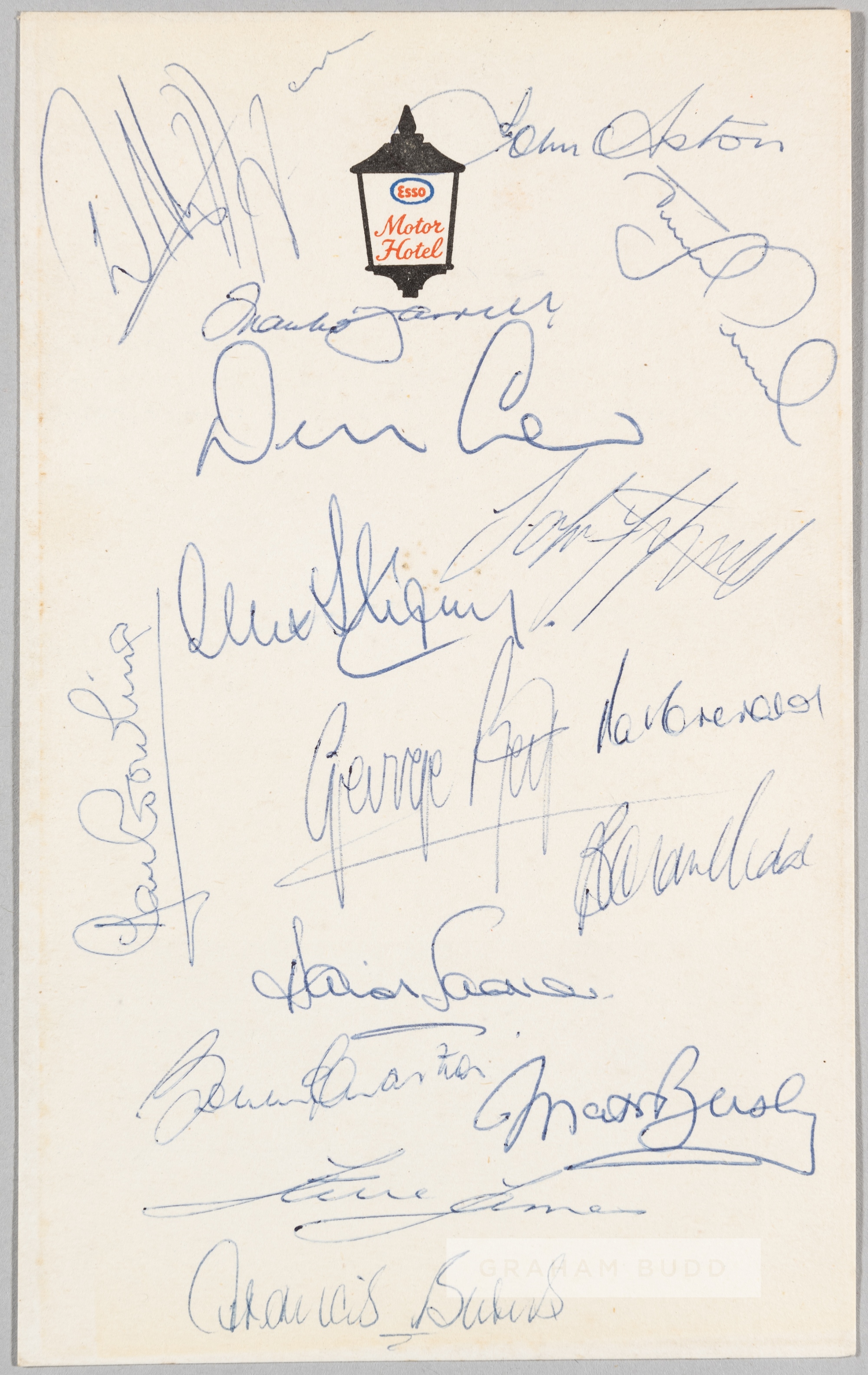 Manchester United 1970-71 team signed menu card, the card bearing Esso Motor Hotel emblem, signed by 16 squad members including Best, Law, Busby, Morgan, Dunne, Aston, Fitzpatrick, Stepney, Gowling, Crerand, Kidd, Sadler, Charlton, Burns and more, signed in blue ink Provenance: obtained by a gentleman who worked at the Esso hotel in Luton.