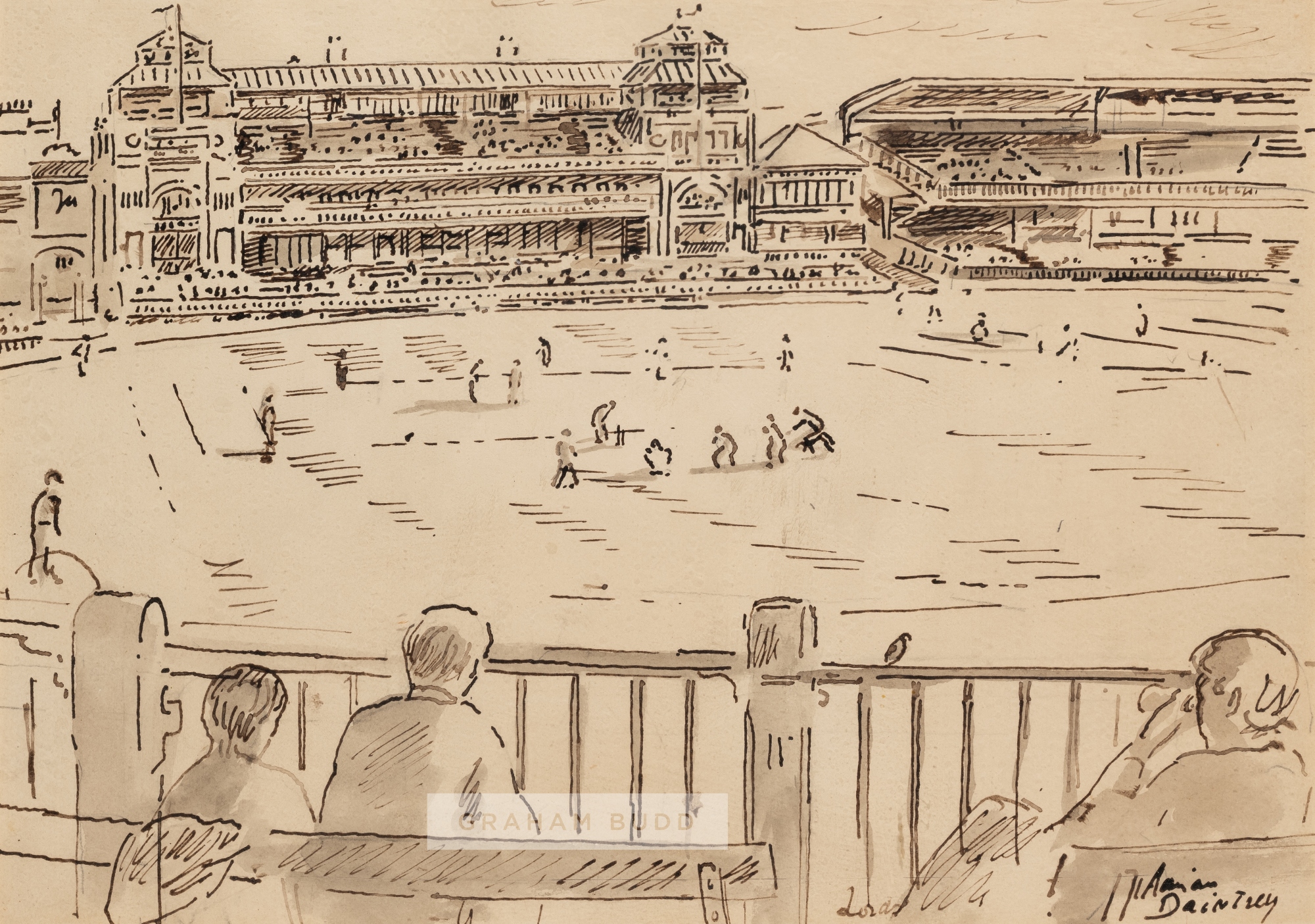 Adrian Daintrey RWA (British, 1902-1988) "Lord's Cricket Ground" drawing, circa 1960s. Pen, ink and wash drawing of Lord's cricket ground looking towards the pavilion and Warner Stand from the Mound, with a match in progress. Signed lower right, mounted, glazed and framed, overall size 52 by 63cm. Please be aware all glass will be removed from framed and glazed items prior to posting and may result in delays to shipping your items. (This service is included in the cost of postage and packing). We can also totally remove all framing and mounts upon request to reduce shipping costs. Alternatively lots can be collected in person by prior appointment from NN8 1RT.