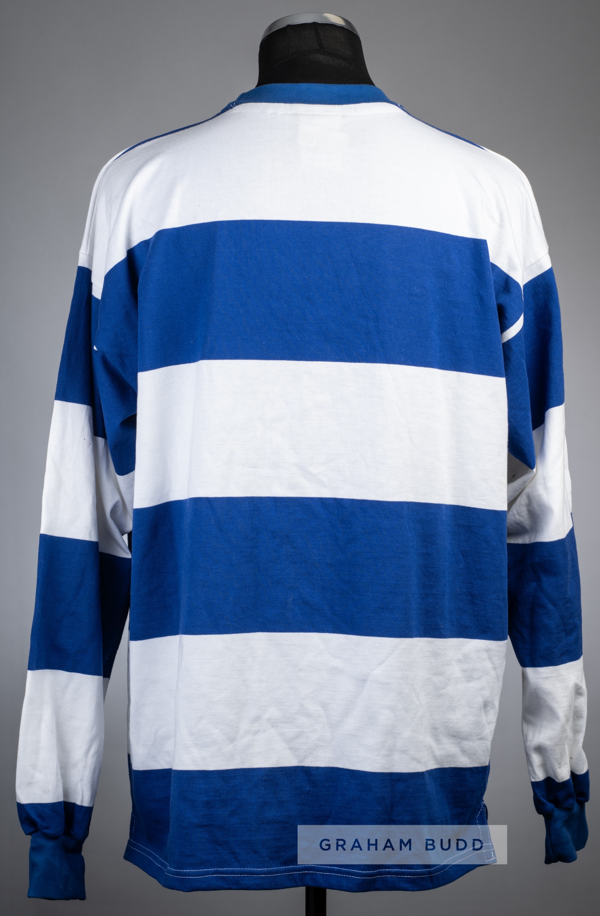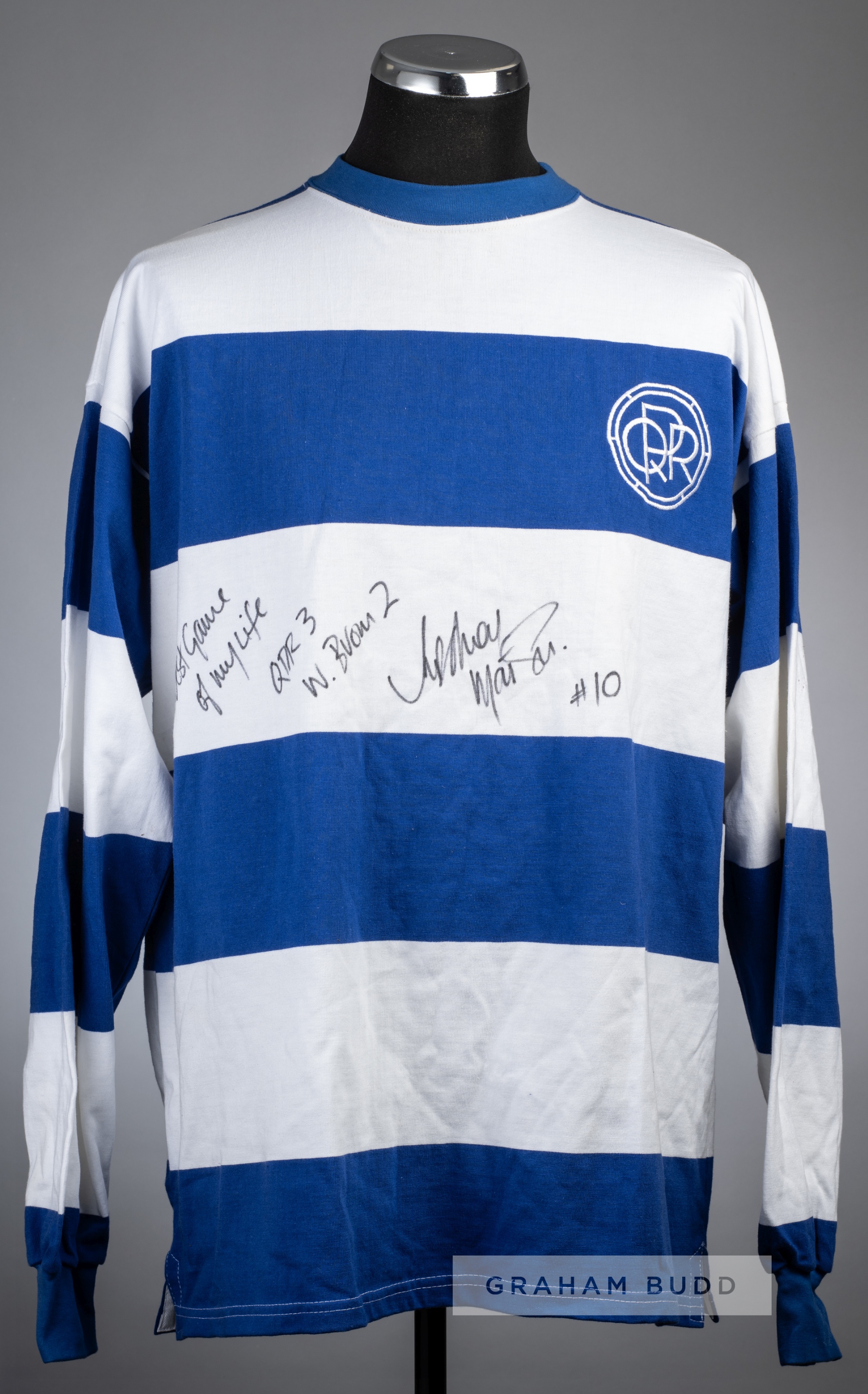 Queen's Park Rangers retro jersey signed by Rodney Marsh, Score Draw blue and white hooped jersey, signed in black marker pen