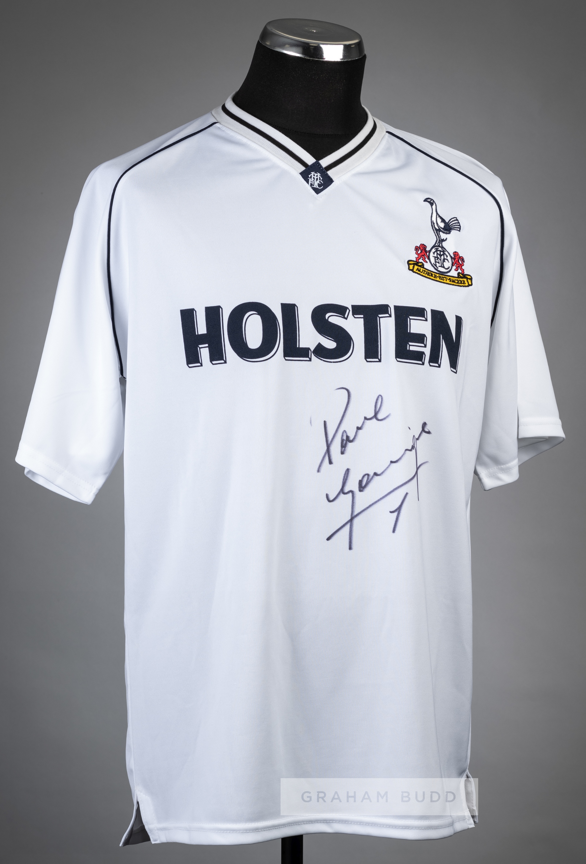 Paul Gascoigne signed white Tottenham Hotspur retro jersey, Score Draw, signed in black marker pen, with Sporting Legends COA