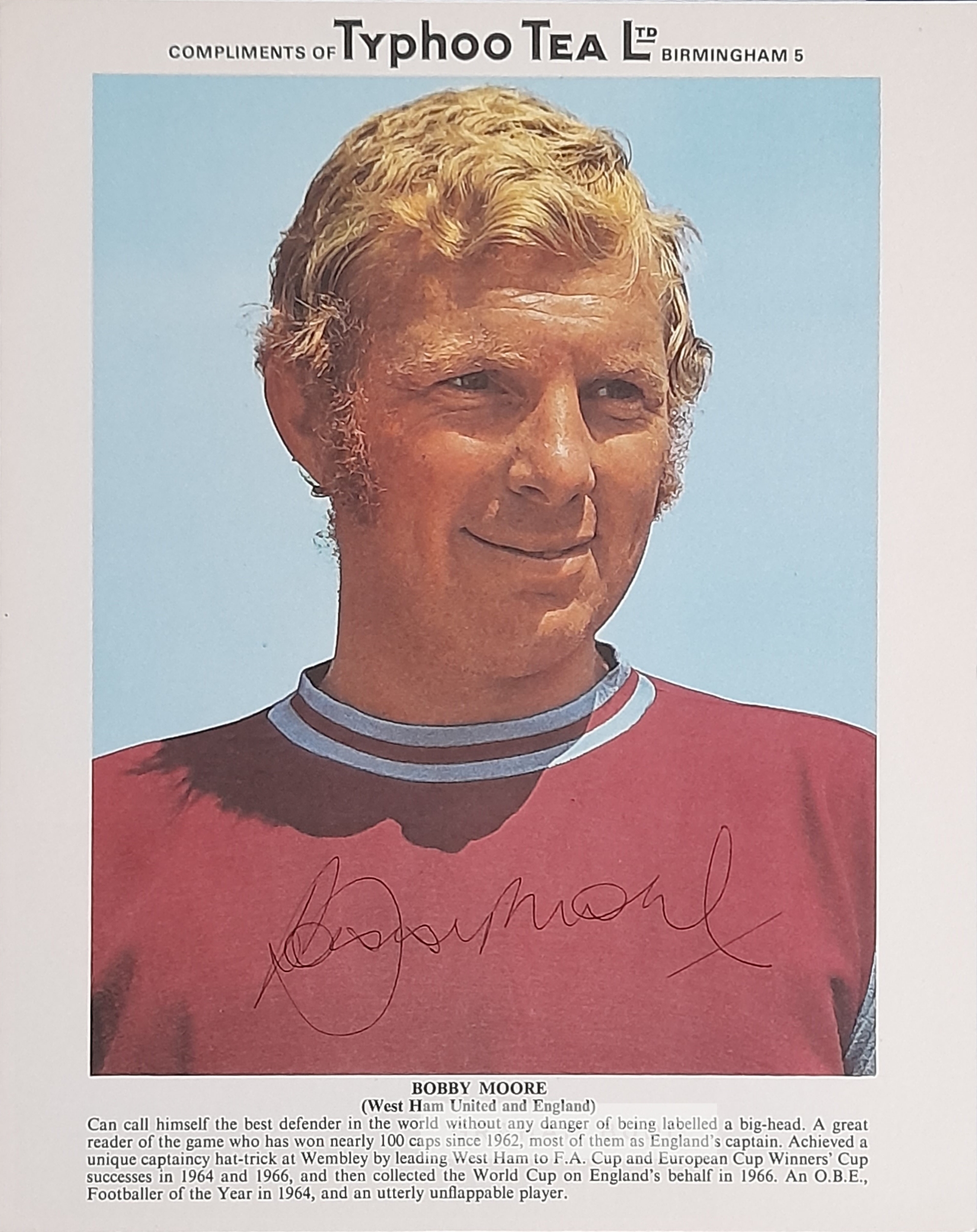 England and West Ham United's Bobby Moore signed Ty-Phoo 3rd series photograph card, legendary captain has neatly and boldly signed this item in black biro across his chest, stunning signature, 10 by 8in., comes with COA