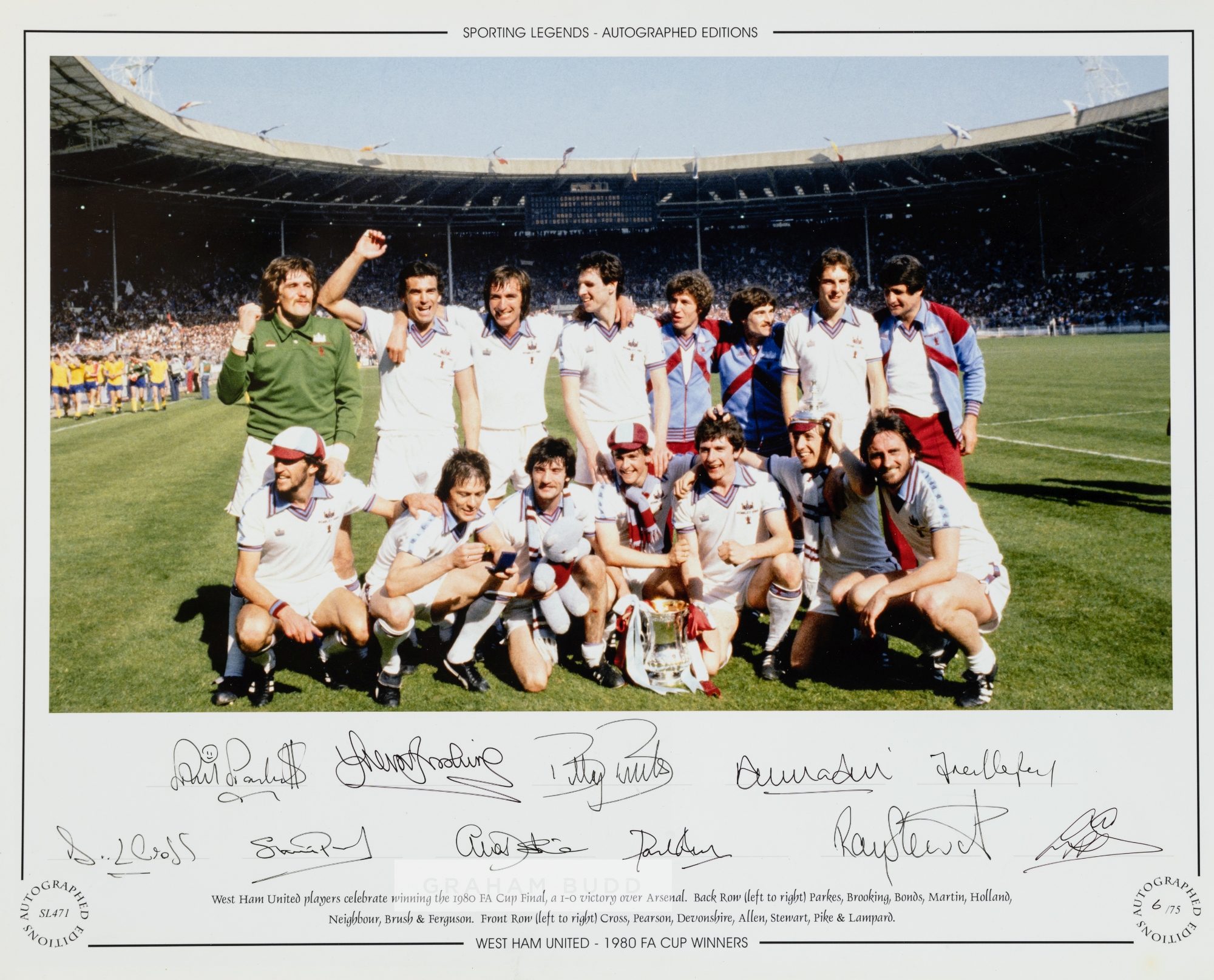 FOOTBALL - West Ham United 1980 F.A Cup winners large 20” x 16” signed Limited Edition 6/175 display photograph depicting the F.A. Cup winning team fully autographed by the West Ham United team, 11 original ink signatures including: Phil Parkes, Trevor Brooking, Alvin Martin, Frank Lampard, Billy Bonds, Alan Devonshire, Paul Allen, Stuart Pearson, David Cross, Geoff Pike and Ray Stewart.
