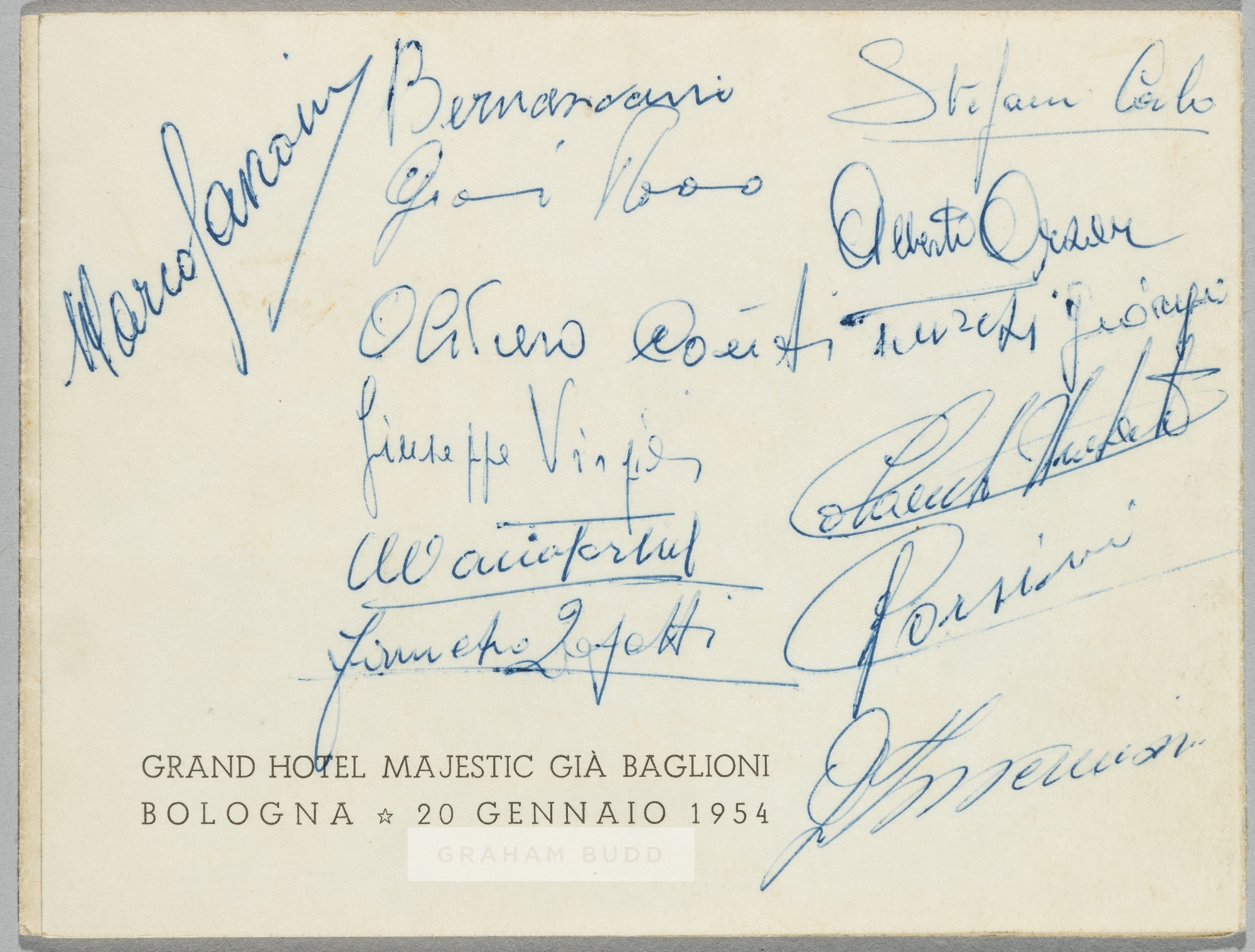 Grand Hotel Bologna menu card signed by footballers from the Italy v England international played in Bologna, 20th January 1954, signed on the front