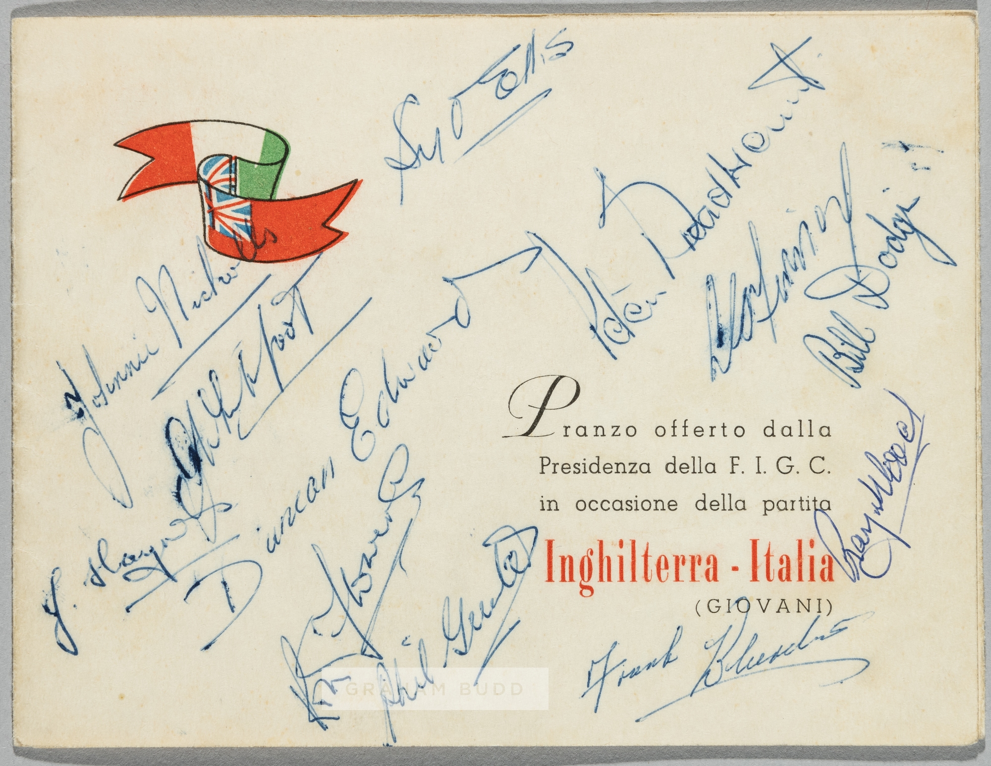 Grand Hotel Bologna menu card signed by footballers from the Italy v England international played in Bologna, 20th January 1954, signed on the front by 12 of the England team and on the inside back by 13 of the Italian team, signatures include England: Edwards, Flowers, Haynes, Broadbent, Dodgin, Whitefoot, Finney, Nicholls, Blunstone, Ellis, Gunter, Wood, (lacking Leary) and Italy: Ideo, Comaschi, Bernasconi, Zagatti, Virgili, Savioni, and others, signed in blue ink Italy defeated England 3-0.
