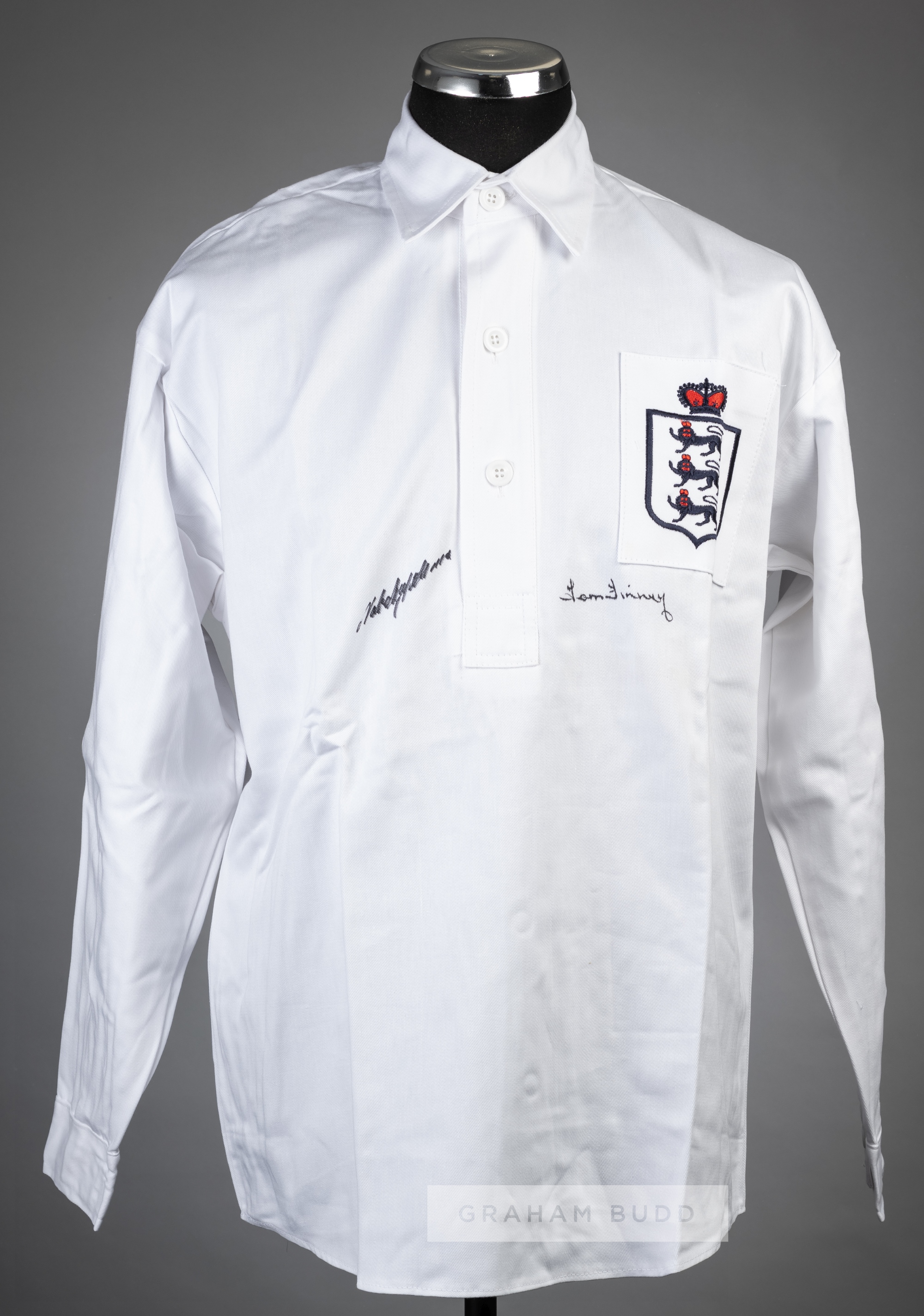 Tom Finney & Nat Lofthouse signed white England retro jersey, Toffs, signed in black marker pen, with Sporting Legends COA
