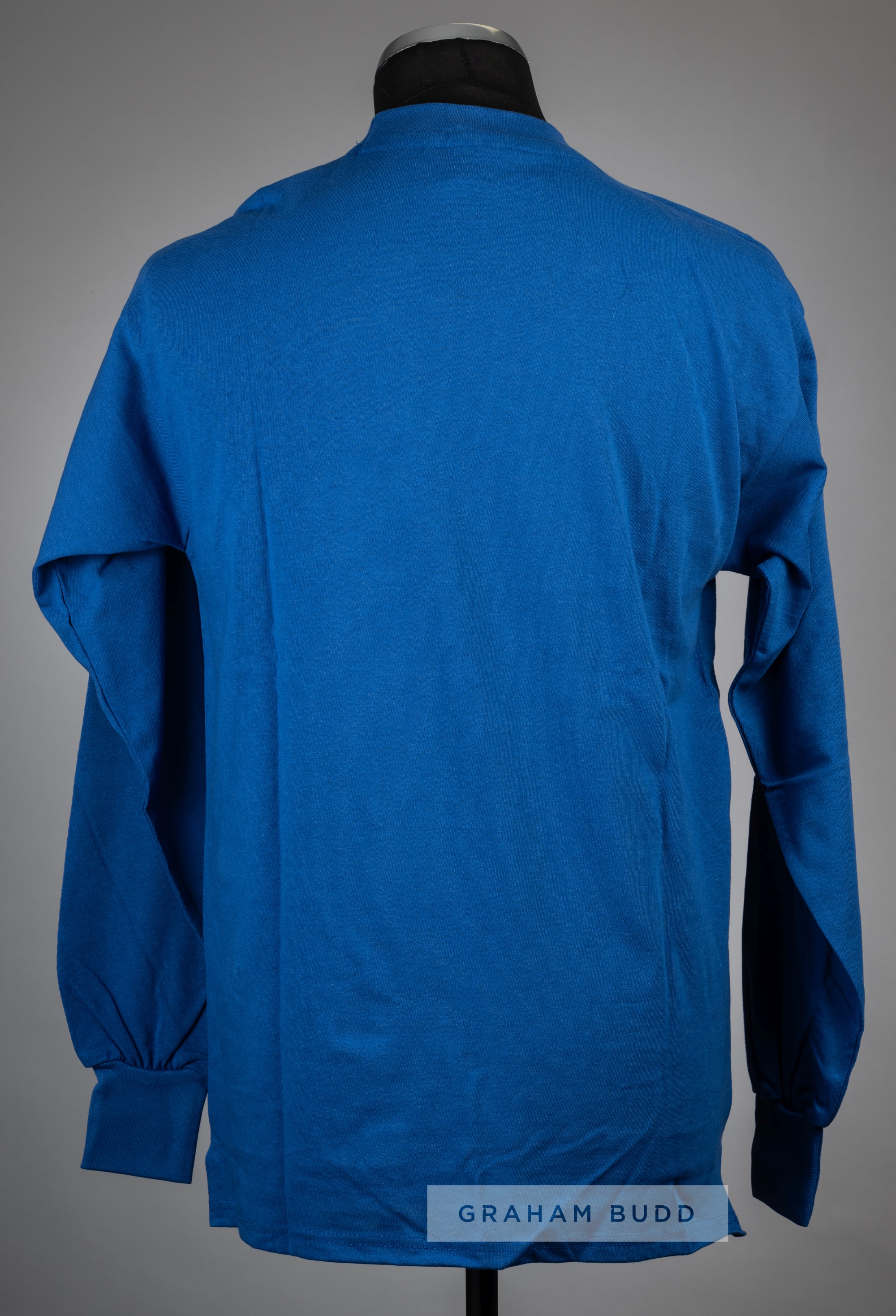 Rangers FC team-signed blue 1972 European Cup Winners' Cup Final retro jersey, long-sleeved, embroidered EUROPEAN CUP WINNERS CUP FINAL 1972 with club crest, full set of 11 signatures of the winning Rangers team in silver marker pen including John Greig, Colin Stein, Willie Johnston and others, with Sporting Legends COA Rangers beat Dynamo Moscow 3-2.