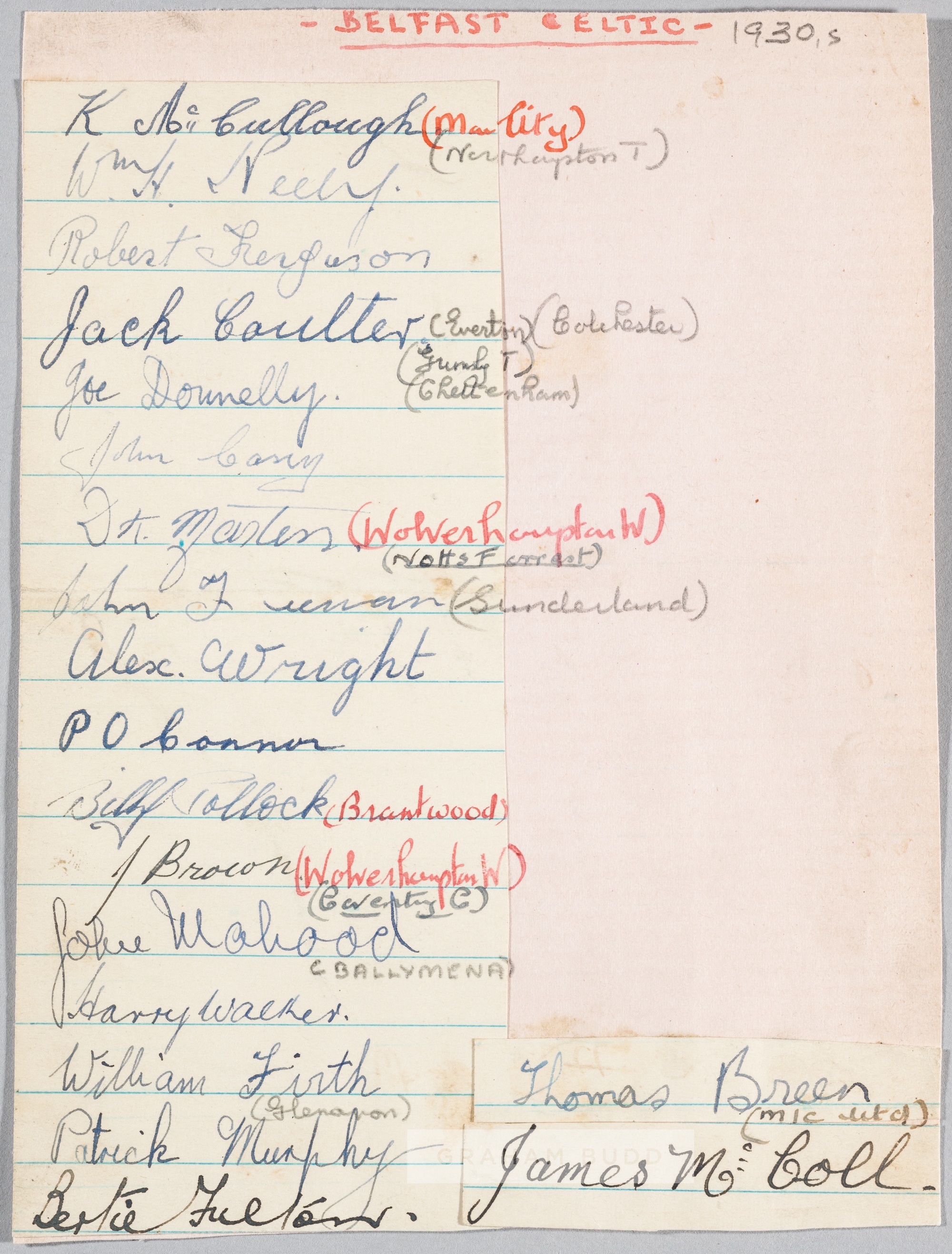 Belfast Celtic team autograph page, circa 1930s, signatures in pen on paper laid onto an album page include McCullough, Neely, Donnelly, Wright, Firt