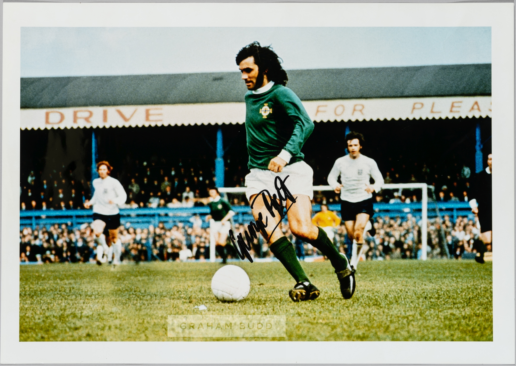 FOOTBALL - GEORGE BEST NORTHERN IRELAND CIRCA 1968 16 ½” x 11 ¾” ORIGINAL AUTOGRAPHED FOOTBALL DISPLAY PHOTOGRAPH George Best (22 May 1946 – 25 November 2005) was a Northern Irish professional footballer who played as a winger for Manchester United and the Northern Ireland national team. In 1968, he won the European Cup with Manchester United, and was named the European Footballer of the Year and FWA Footballer of the Year. The Irish Football Association described him as the "greatest player to ever pull on the green shirt of Northern Ireland". EXCELLENT BLACK AND WHITE 16 ½” x 11 ¾” PHOTOGRAPH, DEPICTING GEORGE BEST IN FULL LENGTH ACTION PLAYING FOR NORTHERN IRELAND. BEAUTIFULLY AUTOGRAPHED IN BLACK INK BY GEORGE BEST TO THE LOWER LEFT CLEAR PORTION OF THE IMAGE. EXCELLENT CLEAN CONDITION, IDEAL FOR DISPLAY.
