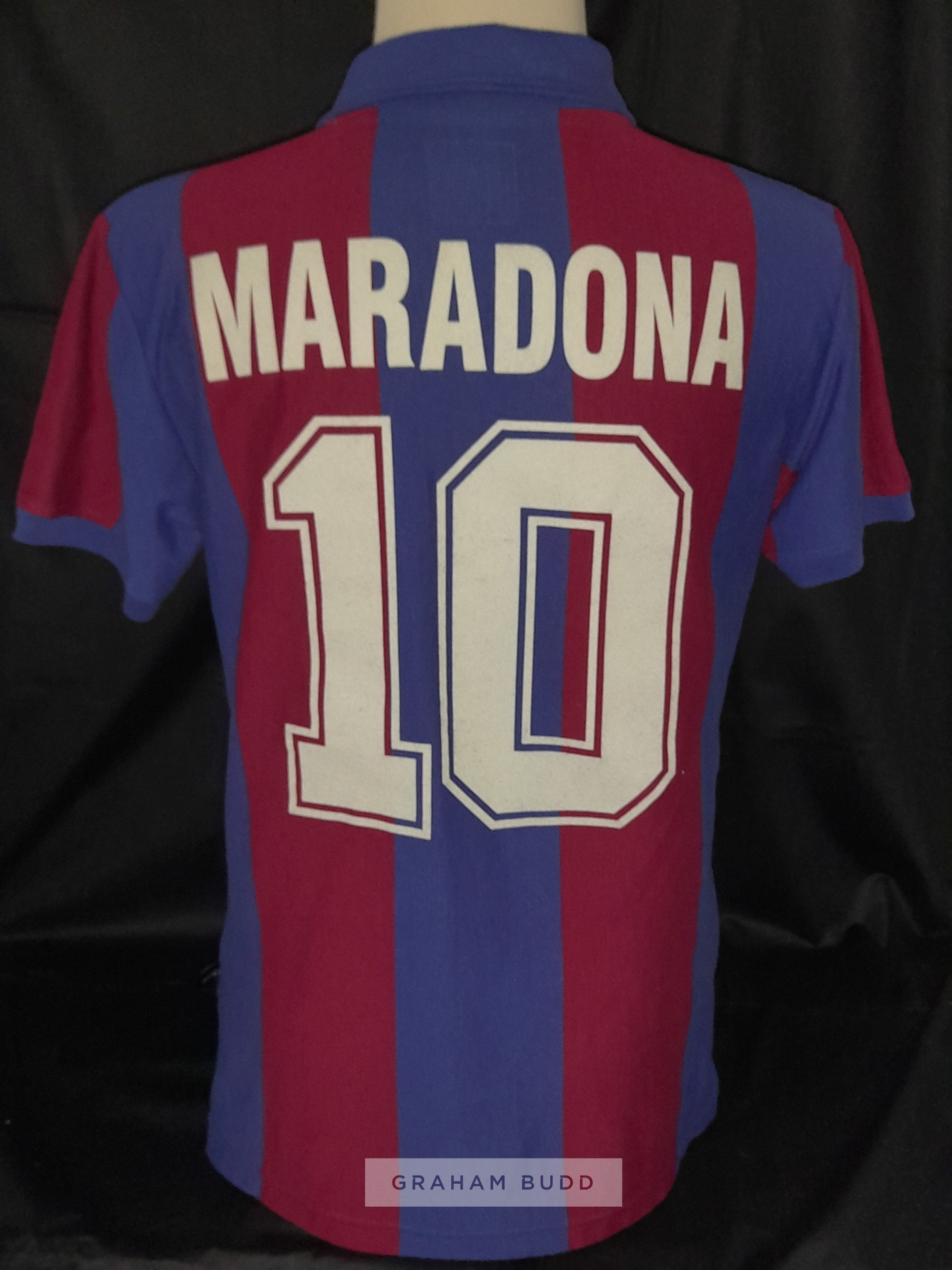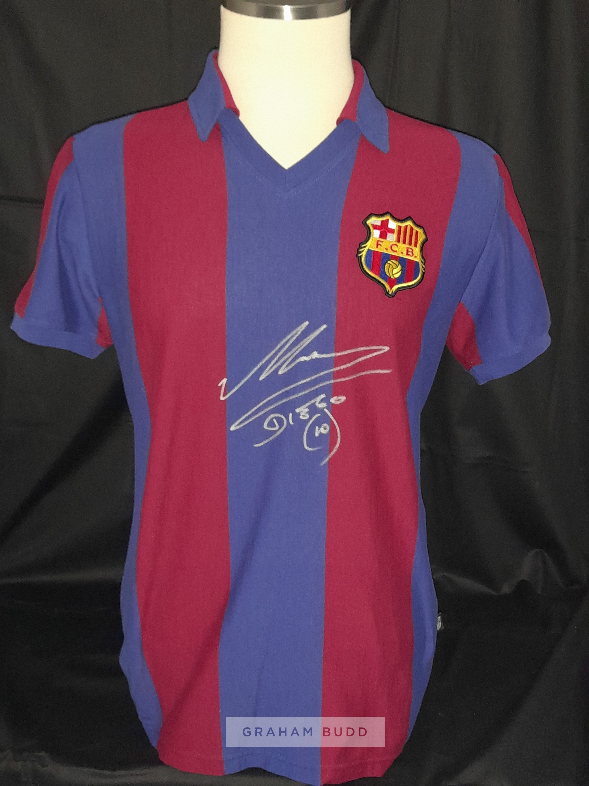 Diego Maradona signed Barcelona replica home jersey, autographed to front, Maradona moved to the Catalan giants for a then World record fee of £5 mi