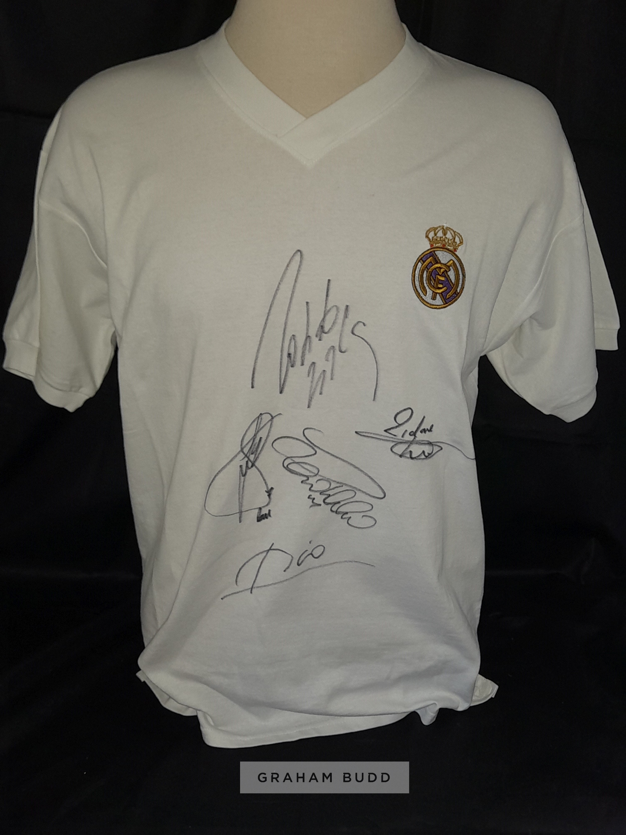 Real Madrid retro cotton style home jersey signed by five Galacticos of the Bernabeu, Roberto Carlos, Zinedine Zidane, Raul, Figo and Ronaldo De Lima,
