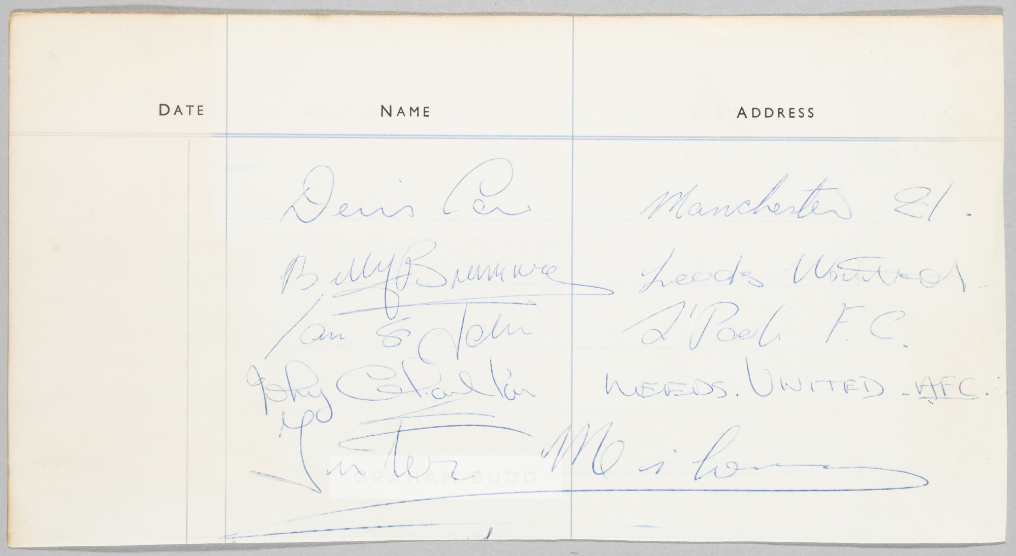 FOOTBALL - Part page from a hotel visitor’s book page signed (with additional team name) by Billy Bremner (Leeds), Ian St John (Liverpool), Jack Carlton (Leeds), Denis Law (Manchester United) plus one other (possibly Jackie Milburn).