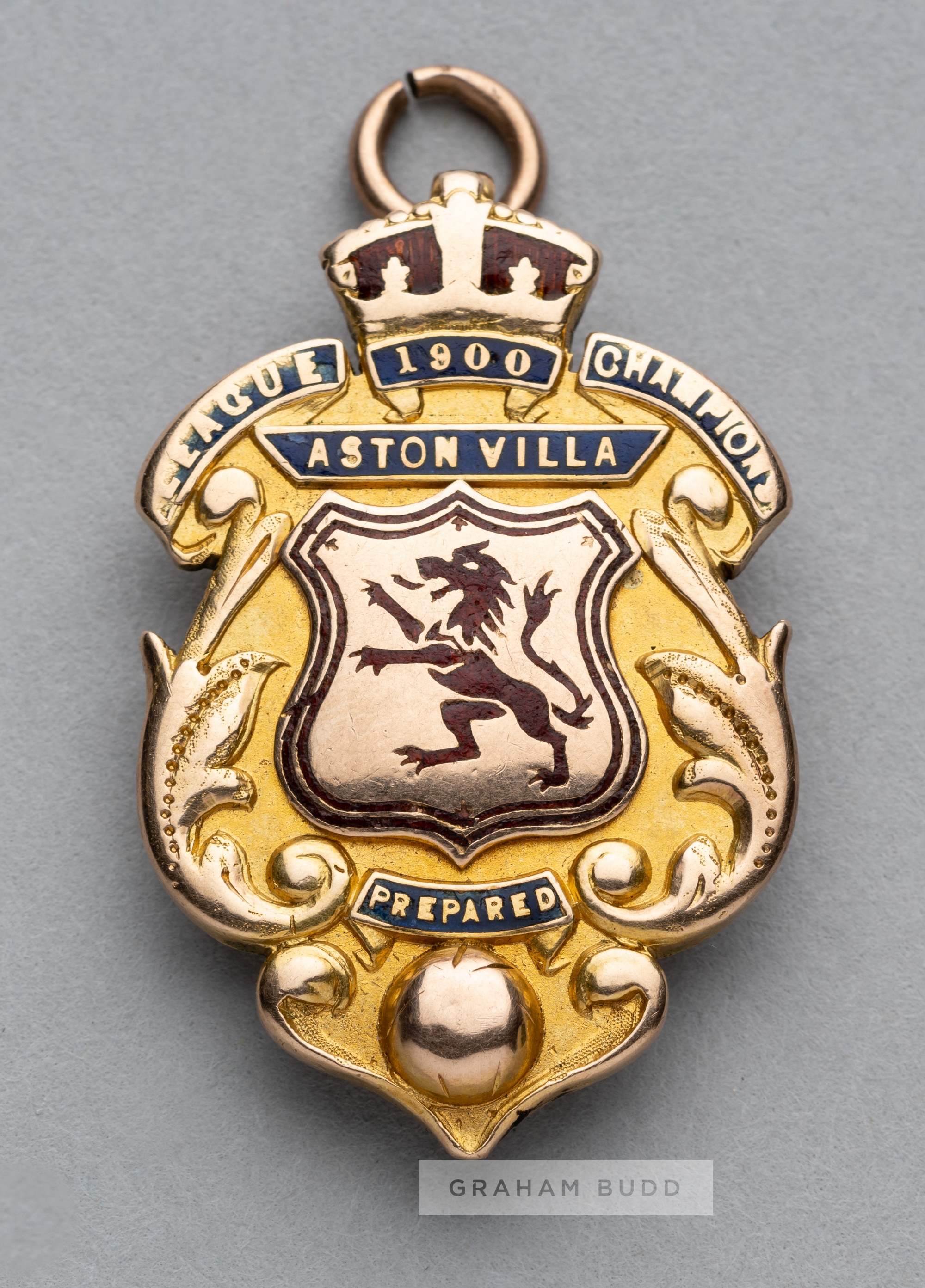 1899-1900 Football League Division One championship medal awarded to the Aston Villa Director C.S. Johnstone, obverse enamelled with red lion and LEAGUE CHAMPIONS 1900 ASTON VILLA PREPARED, reverse enamelled with C.S. JOHNSTONE DIRECTOR 1900, shield shaped with suspension ring, 15ct Birmingham 1900 by Vaughton & Sons, 38 by 24mm., weight 19gms., in associated case