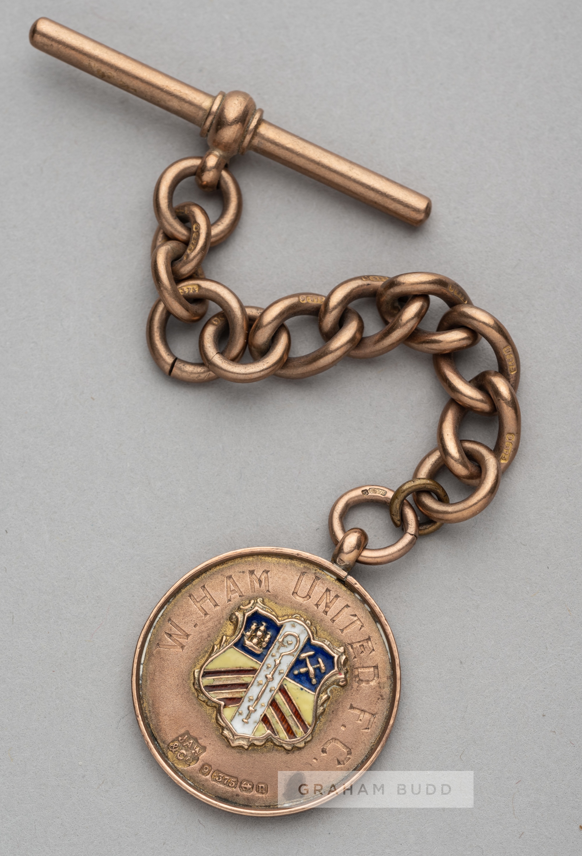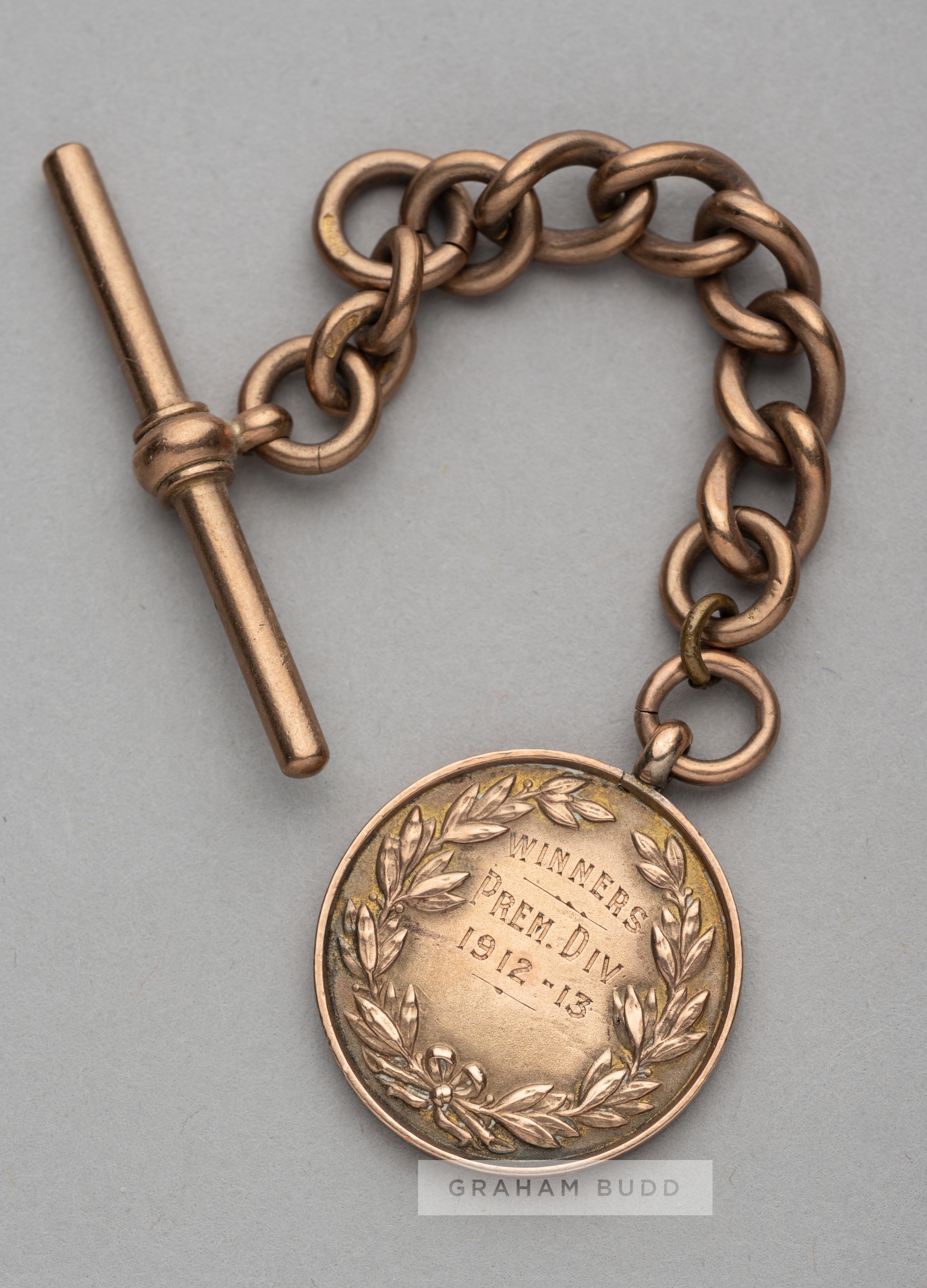 London League Premier Division Championship winner's medal awarded to West Ham United Reserves player v Croydon Common Reserves, season 1912-13, obverse engraved W. HAM UNITED F.C surrounding a central enamel crest, reverse engraved WINNERS PREM. DIV 1912-13, circular with suspension ring and a later 9ct gold curb link albert, hallmarked 9ct gold Birmingham 1912 by J A Wylie & Co., diameter 25mm., weight 20gms. West Ham United defeated Croydon Common 2-1. A gold medal was awarded to each player who took part in the 'Play-off' between Sections A and B of the London League Premier Division 1912-13, West Ham United Reserves were Section A winner's and Croydon Common Reserves were Section B winner's.