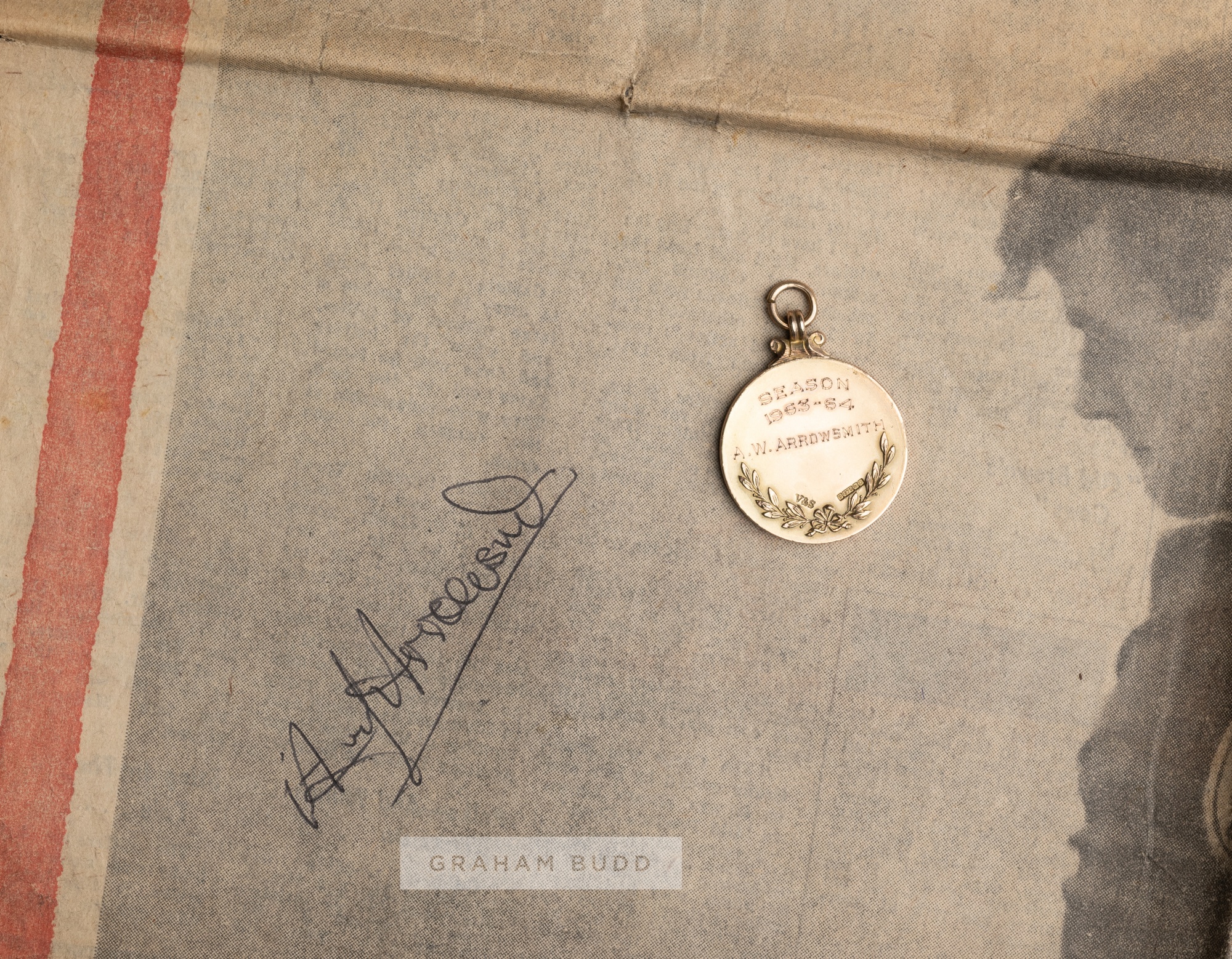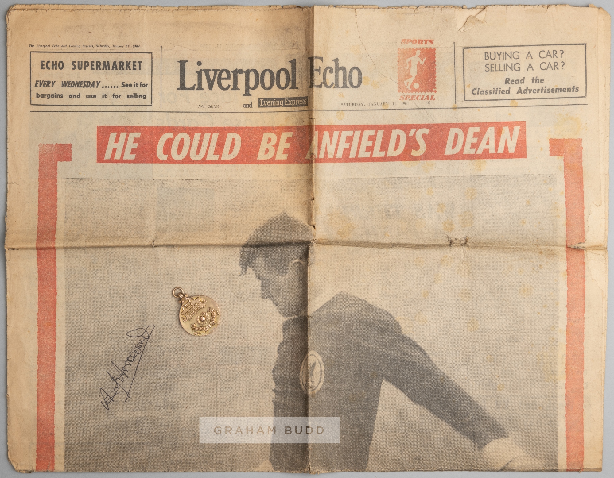 The Football League Division One championshio medal awarded to Liverpool's Alf Arrowsmith in season 1963-64, obverse with football in relief and THE FOOTBALL LEAGUE CHAMPIONS DIVISION ONE, reverse engraved SEASON 1963-64 A.W. ARROWSMITH, circular with suspension ring, 9ct Birmingham 1963 by Vaughton & Sons, diameter 28mm., weight 15gms., in original case, with tooled lid, case bears wear and damage; sold with Alf Arrowsmith signed Liverpool Echo, dated 11th January 1964, signed in black ink on the b & w image of Dixie Dean, newspaper bears war, folds and creases, (2)