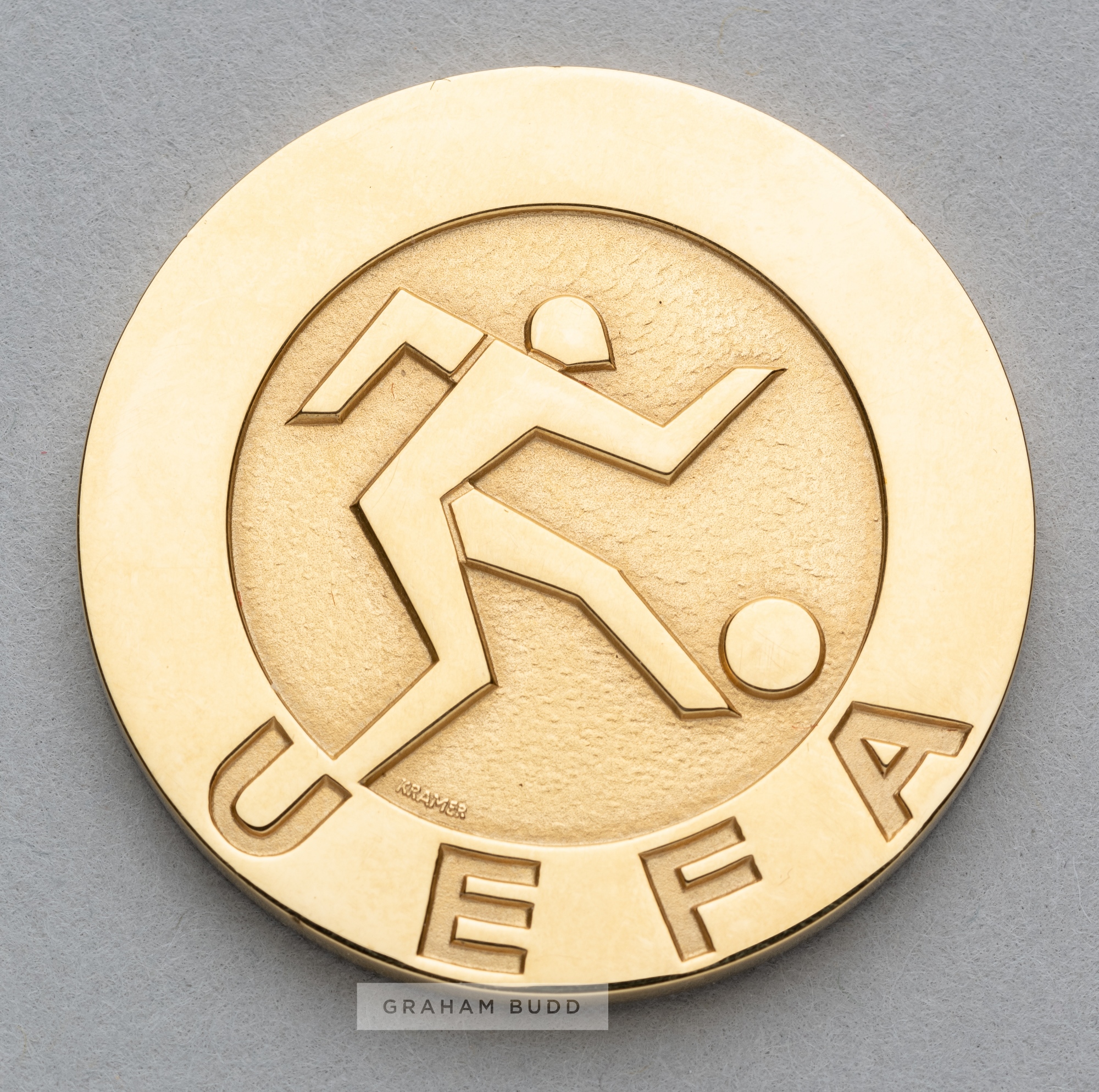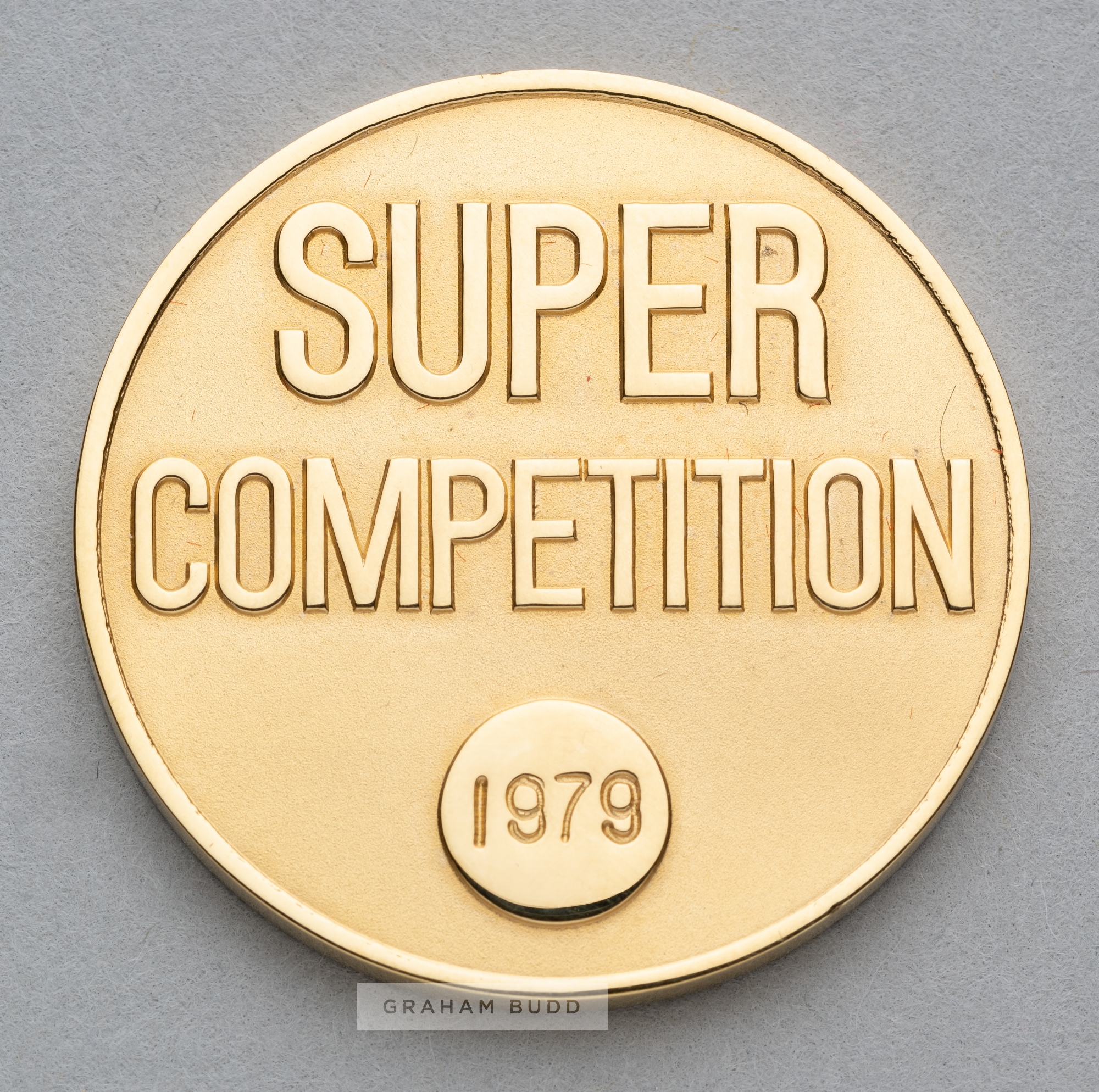 1979 UEFA European Super Cup winners' medal awarded to an unknown Nottingham Forest player, obverse with footballer in relief and UEFA, reverse with SUPER COMPETITION 1979, yellow metal circular medal, diameter 32mm., with original fitted case. Played over two legs, Nottingham Forest defeated Barcelona 1-0.