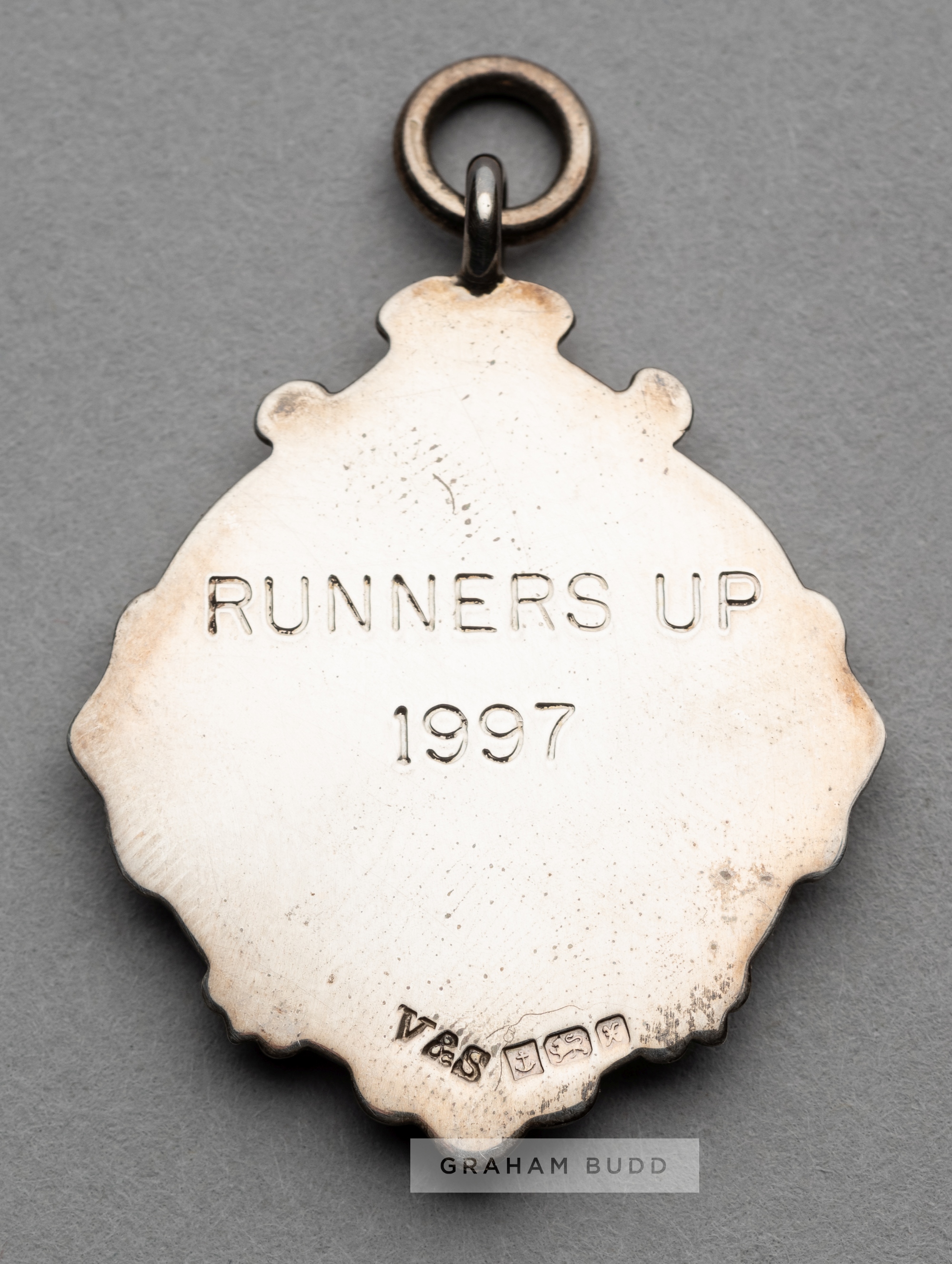1997 Coca-Cola Football League Cup runners-up medal awarded to Middlesbrough's Clayton Blackmore, silver & enamel, obverse with trophy cup in relief surrounded by THE COCA-COLA CUP in red enamel, reverse engraved RUNNERS UP 1997, shield shaped with suspension ring, hallmarked silver Birmingham 1997 by Vaughton & Sons, weight 13gms., 36 by 28mm., within a fitted case the hinged lid gilt tooled with logo and THE FOOTBALL LEAGUE Leicester City defeated Middlesbrough in the final replay 1-0. Clayton Blackmore played for Middlesbrough during 1994-99, making 53 appearances scoring four goals. The replay was held at Hillsborough, 16th April 1997. Provenance: Clayton Blackmore collection Sotheby's auction Lot 92 14th July 2002.